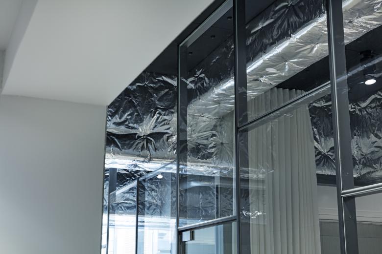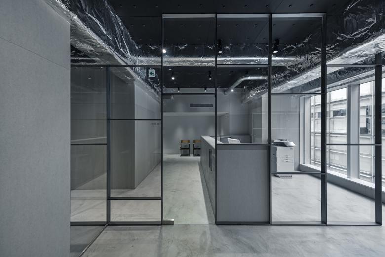 と、こう書いてしまえばなんてこともないのだが、医療系用途は非常に「かたい」用途である。医療法を考慮しなければならないし、レントゲン室などの特殊な室や医療機器に対する配慮も必要だ。そして、何よりも人々(医療従事者も、患者も)が期待する医療施設像は極めて保守的であり、天井を張らないことやガラスで間仕切ることには大きな抵抗がある。でもその抵抗は共同幻想ともいえるクリシェみたいなもので、よくよく話を聞いてみると明確な理由がなさそうだ。たとえばガラスの壁は傷付きにくいし、薬品にも強い。指紋は目立つけれどそれは汚れなのだから、拭けばむしろ衛生を保てる。診察室の音と視線の問題は天井から分厚めのレースのカーテンを重ねることで、運用上の支障はない。上階のスラブ下にグラスウールのマットを貼り、梁に設備配管の保温材を巻いて吸音しているので、音環境も悪くはない。そして何よりも奥の診察室にいても窓の外に銀座の風景が見えて開放的なのである。
