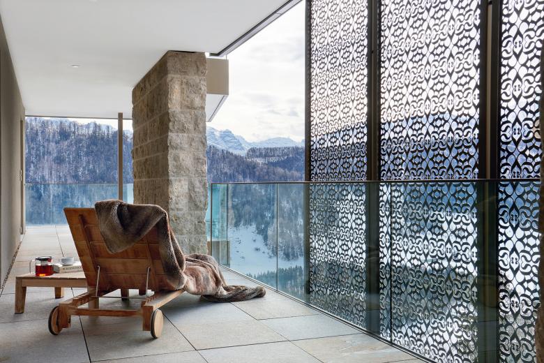 Diese verbinden in zeitgenössischem Interior Design moderne, traditionelle und lokal-alpine Elemente. Die Naturstein- Fassade mit bronzefarbenen Metallornamenten entstand als Spiel zwischen klassischer Materialisierung und moderner Formgebung. Als wiederkehrendes Element prägen die Ornamente die Gestaltung des gesamten Gebäudes.