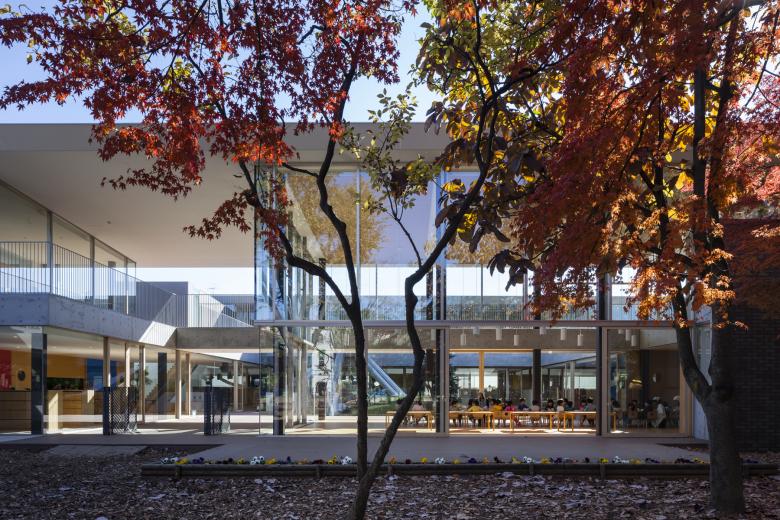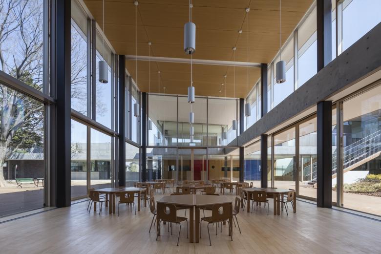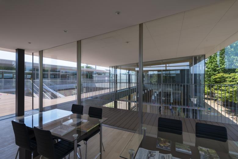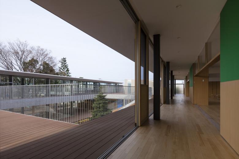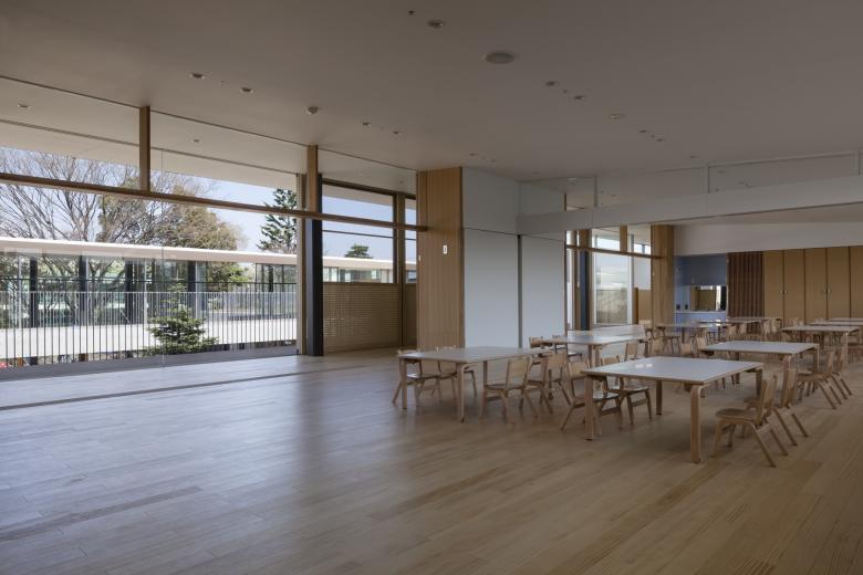 Considering the overall site plan, we decided to create a transparent living space for children encircling a new patio in order to enhance the existing spaciousness. The sequence of facilities runs north to south from the existing kindergarten building, playground, yard in the woods, nursery lunchroom, patio, and the south building containing nursery rooms. The individual characteristics of place and space as well as the transparency of each specific element have been designed to remain intact, and expansive space characteristics of the entire site leading to the outer world can be felt from any location.