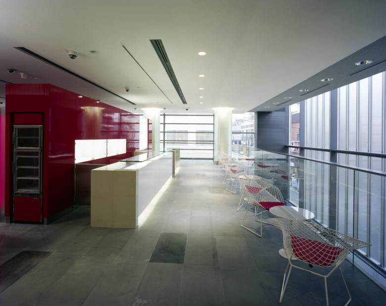 Furthermore, the north side facing the old Kawagoe Highway features a vertical glass screen to provide scale to the finely divided streetscape. The upper portion is frosted to diffuse the stable northern light into the interior spaces. The west side employs deep canopy-like sashes to reflect and diffuse the deeply penetrating western sunlight, creating a gentle, bright space for the stair area while providing a sense of horizontal expansion.