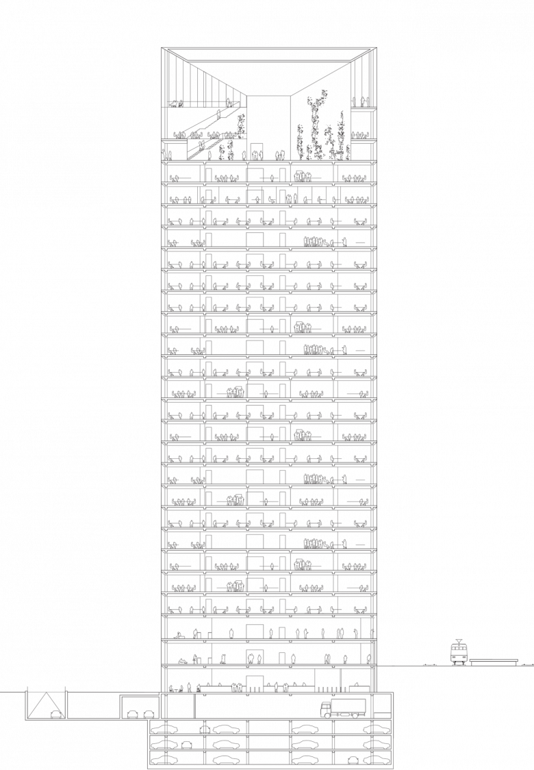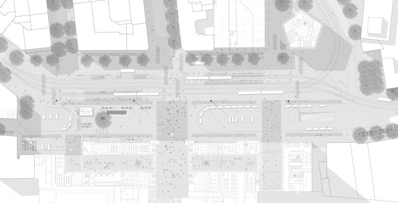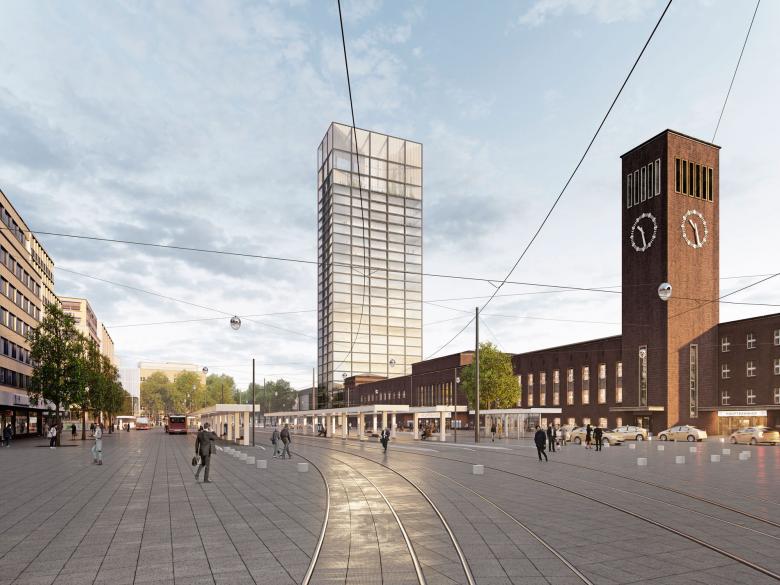 Der neue Hochpunkt des Quartiers versteht sich als vertikale Fortführung des Bahnhofvolumens und als Zielpunkt der Immermannstraße. Der Turm steht also nicht als Solitär am Platz, sondern bildet mit dem Bahnhof ein Gesamtgefüge. Dazu gehört auch, dass unter dem Vorbau des Turmes, mit dem er an den Bestand anschließt, eine gemeinsame Erschließung liegt. Kreuzförmig gruppieren sich hier die Zugänge zur nördlichen Seitenhalle des Bahnhofs, zu den Büroflächen und den öffentlichen Aussichtsterrassen des Turmes, als auch zum Konrad Adenauer Platz.