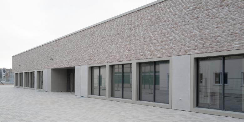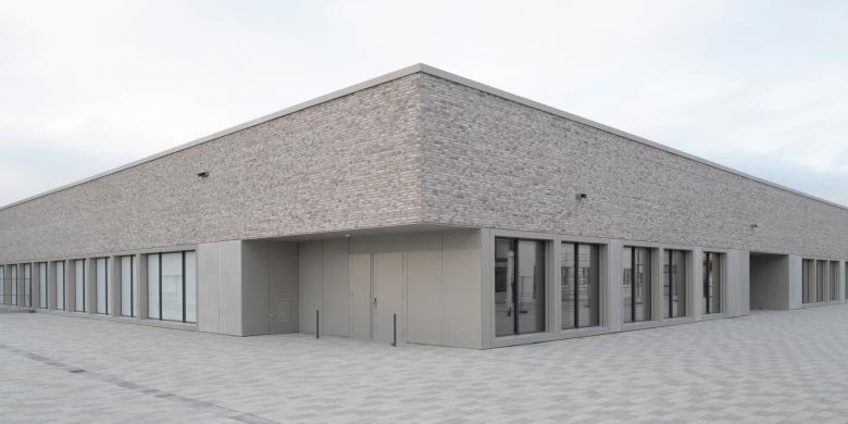 Die Sporthalle bildet mit der Oscar-Paret-Schule den Schulcampus im Zentrum Freibergs. Die Zugehörigkeit der beiden Gebäude zueinander wird durch die gleiche Fassadengestaltung und Materialität hervorgehoben.