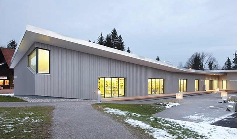 Der Neubau wurde eingeschossig geplant um den Bezug zum gemeinsamen Platz und dem Aussenraum möglichst intensiv zu gestalten. Wegen des mittelfristigen Bedarfs und der allgemein unsicheren Zukunft des Standortes wurden die Gebäude für eine Lebensdauer von min. 30 Jahren konzipiert. Es wurde eine Holz-Elementbauweise mit hohem Vorfertigungsgrad gewählt, welche eine kurze Bauzeit ermöglicht. Die Materialisierung bevorzugt ökologische, robuste Werkstoffe und nachhaltige konstruktive Lösungen. Nach Aussen fügen sich die Fassade elegant im Kontext ein, nach Innen wirken die Räume frisch und grosszügig.