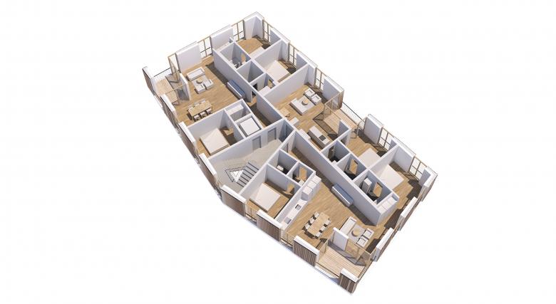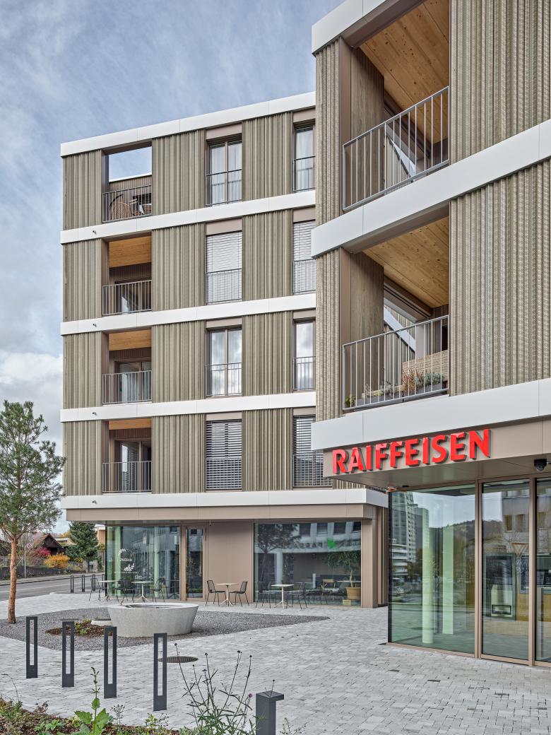 Das Grundstück der Raiffeisen Lägern Baregg, für den Ersatzneubau in Wettingen, liegt an der Zonengrenze zur Dorfzone. Als nördlicher Abschluss der Alberich Zwyssigstrasse entsteht eine markante, dennoch differenzierte Situation mit abgestuften Volumen und einem freundlichen Quartierplatz. Mit der Setzung der zwei artikulierten Baukörper wird eine Transition von den grossen Massen entlang der Landstrasse zur kleinteiligen, organisch gewachsenen Dorfstruktur erstellt. Die Permeabilität und die Höhenabstufung der Gebäudeteile schaffen interessante, visuelle Durchblicke und diagonale Bezüge. Es entsteht ein charaktervolles Ensemble, in dem man leben und arbeiten möchte, eine nachhaltige Architektur, die der Raiffeisenbank als zukunftsorientiertes und vertrauenswürdiges Dienstleistungsunternehmen entspricht.