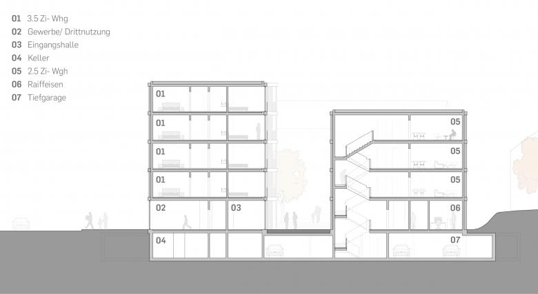 Es werden kompakte Gebäude angestrebt, deren Struktur flexible Anpassungen in Zukunft erlauben. Im Erdgeschoss, um dem Quartierplatz, sind die Geschäftsstelle Wettingen der Raiffeisenbank Lägern-Baregg und im Gebäude West ein kleines Café vorgesehen. In den Obergeschossen ist ein Wohnungsmix von hauptsächlich 3 ½- und 4 ½-Zimmer-Wohnungen im mittleren Segment geplant. Die Mehrheit der Wohnungen sind, 3-seitig über Eck orientiert. Es entstehen facettenreiche, zeitgemässe Wohnräume mit attraktivem Aussenbereich (Loggia) und nachhaltigem Flair. Die oberen Wohngeschosse sind als Hybridbauweise in Holz-Beton-Verbundsystem konzipiert. Als Vorzeigeprojekt im Bereich der Nachhaltigkeit soll die Überbauung nach den Vorgaben des Standard Nachhaltiges Bauen Schweiz (SNBS) gebaut und mindestens mit einem Zertifikat Gold abgeschlossen werden.