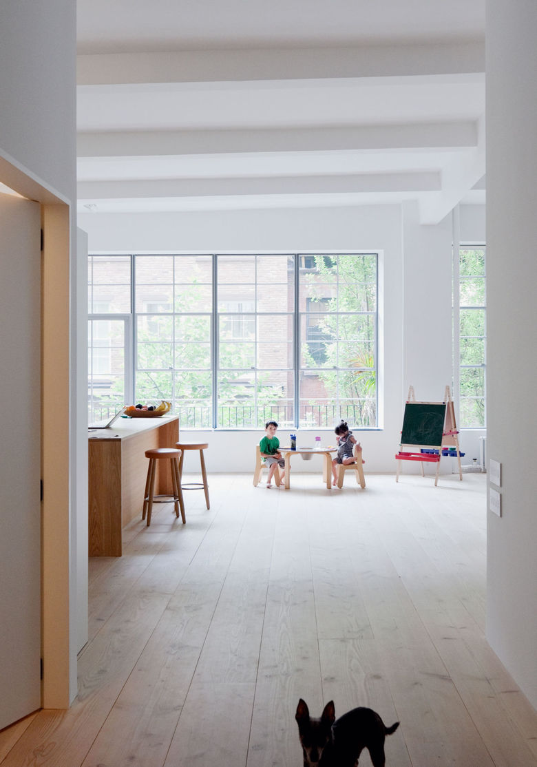 This Greenwich Village loft was previously used as an artist’s studio. The renovation created generous bedrooms and hidden storage for a couple and their two children. Lowering the windowsills in the open living room and kitchen maximizes sun in the common areas. A low wall with reflective glass transom windows allows daylight into the bedrooms while preserving privacy. The south window was converted into a door to create a small outdoor balcony. Each child’s room has closets and a built-in desk, and the large storage room behind the bedrooms serves as circulation between the private rooms. Partitioning the private areas behind a single wall retained the spacious, industrial character of the space.