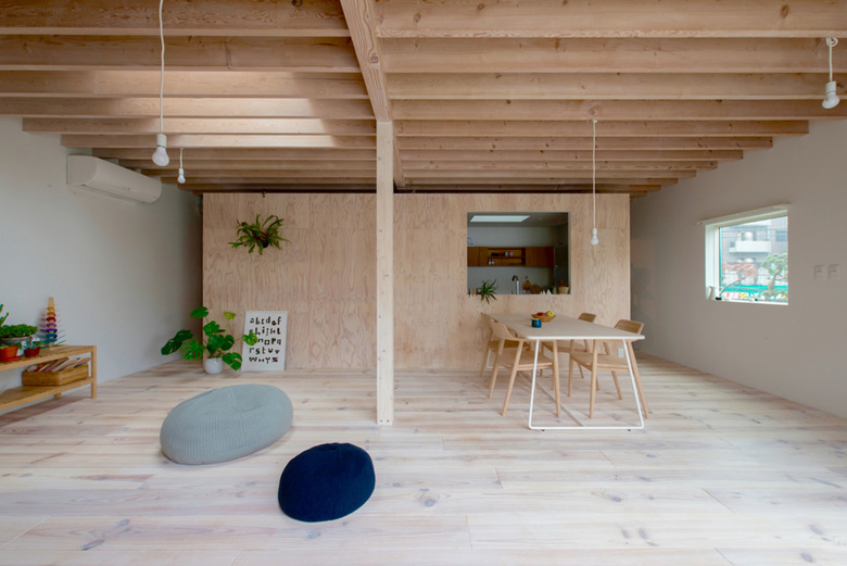 スタディを続ける中で、普段使いの部屋とそれほど日常的に使わない部屋をゾーン分けし、その分けた間に、光と風を導く路地(アレイ)を設けることが自然だと感じていった。そのアレイによって、北側にある祖父の家の庭へとつながりを感じるようになり、建物全体は回廊的な構成にもなる。内部でも、その回廊感は存在させ、水周りのコアを中心に構成されている。
