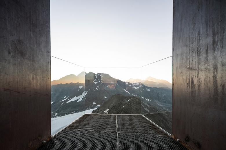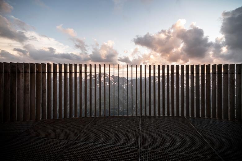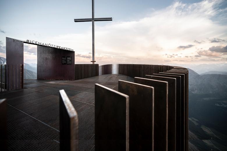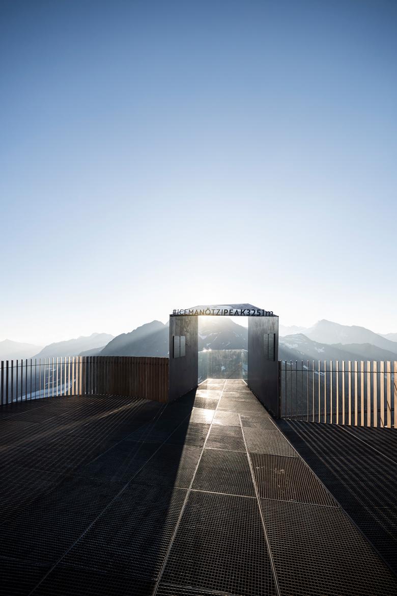 Speaking of time, a geometric funnel was cut into the undulating viewing platform to direct viewers eyes towards something timeless - the place where Ötzi was found. Only a few meters from the Austrian border, the angle of the viewing funnel takes the visitor on a carefully crafted, intellectual journey to the Iceman. The viewing funnel was designed with Corten steel, and like the slats on the railing, the steel turns dark brown, grey and black as it yields to the elements and becomes one with its surroundings. The funnel end is completed with a glass railing which gives your thoughts flight in breathtaking suspense – it seems like you are walking on air.