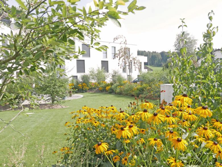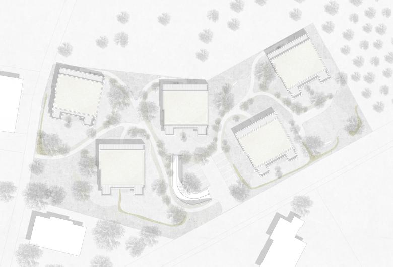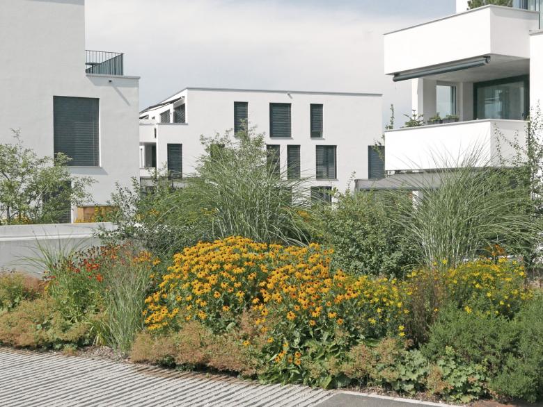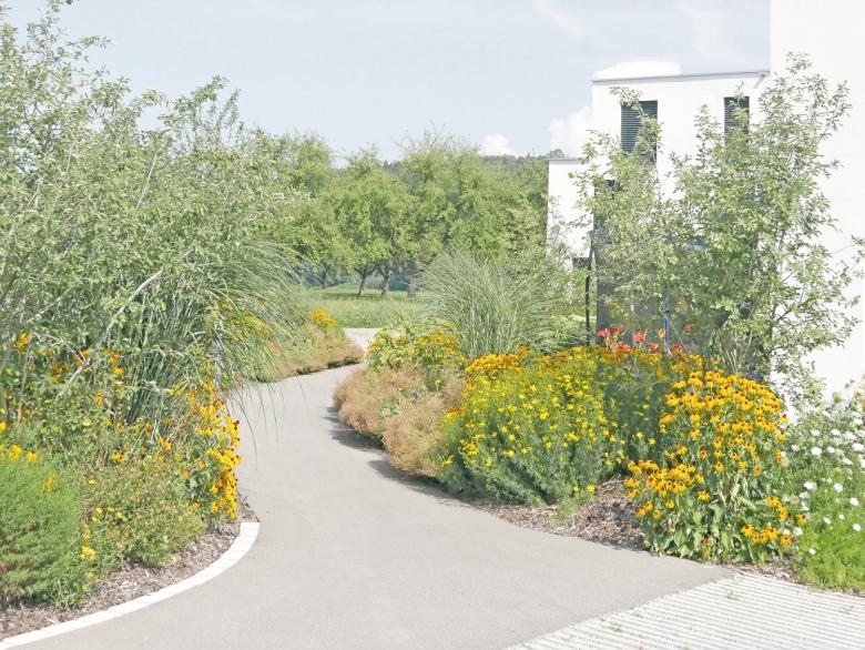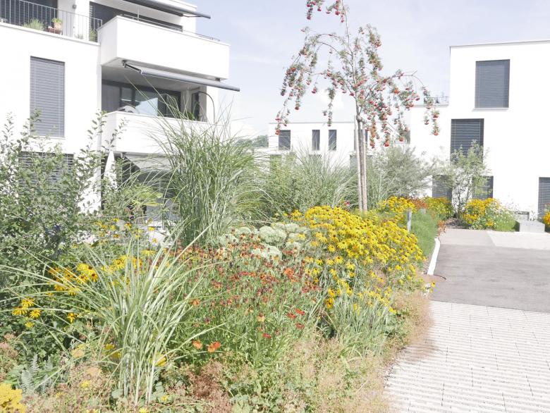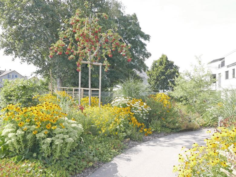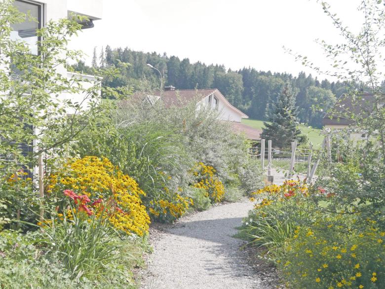Am Rande von Oberbüren, in unmittelbarer Nähe zur Landwirtschaft mit Obstplantagen und weiten Fettwiesen, wurden 25 Eigentumswohnungen in fünf Mehrfamilienhäusern realisiert. Geschwungene, mäandrierende Wege aus Asphalt und abwechselnd reichblühenden Stauden-, Rasen-, und Wildblumenwiesenflächen prägen die Umgebung. Der attraktive Freiraum, welcher grösstenteils über der Tiefgarage angelegt wurde spielt mit Höhen welche sich als hügelige Pflanzflächen bemerkbar machen. Punktuelle Chaussierungen schmiegen sich an die Asphaltwege an und bieten den Bewohnern, neben ihren privaten Aussenräumen, zusätzliche gemeinschaftliche Begegnungsorte. Mehrstämmige, attraktive Blütengehölze ergänzen die üppige Staudenbepflanzung. Ein naturnaher Spielbereich bietet auch den kleinsten und kleingebliebenen Bewohnern etwas Abwechslung. Markante Eichenbalken laden zum Sitzen und Verweilen ein. Einzeln, gezielt gepflanzte Obst- und Wildobstbäume bilden einen subtilen Übergang von der gepflegten Umgebung in den Obsthain. Eine schlichte Beleuchtung inszeniert die gelungene Freiraumgestaltung auch nachts. Die Besucherparkplätze und die Zufahrt zur Tiefgarage sind ab der Unterzilstrasse erreichbar.