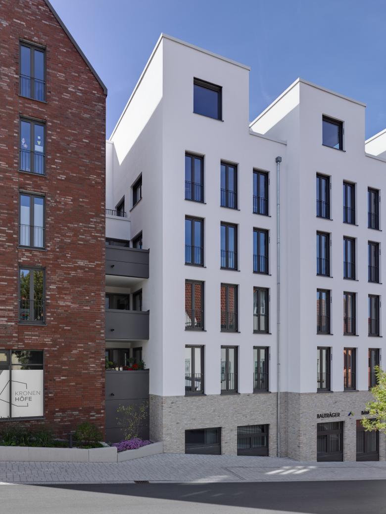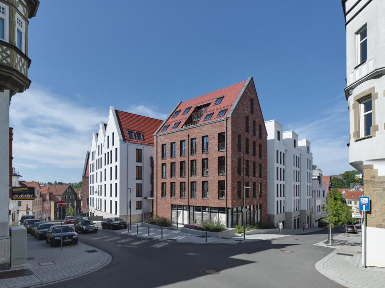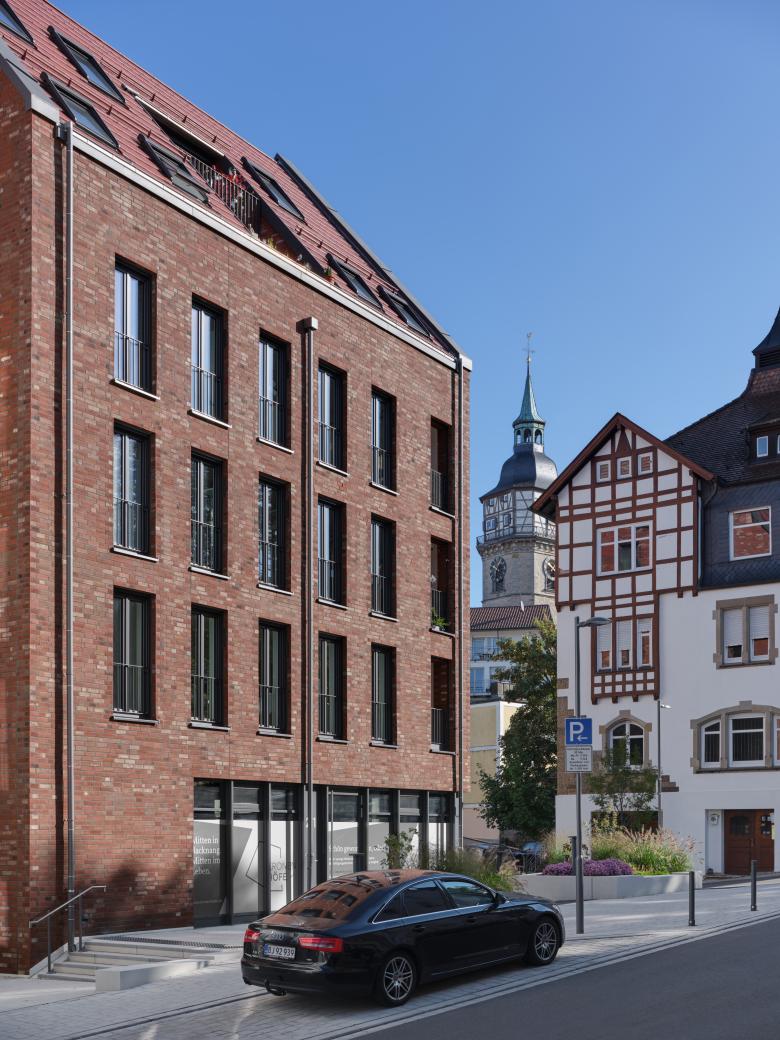 Eine feine Abstufung zwischen Öffentlichkeit und Privatheit kennzeichnet die öffentlichen Räume. Sämtliche Wohnungen verfügen über Balkone oder Loggien, trotz der Strenge der Fassaden, die dem Quartier ein einprägsam-städtisches Bild geben. Die großen, zusammenhängenden Gewerbeflächen im Erdgeschoss eignen sich zur Nutzung durch einen Hauptmieter ebenso wie zur Aufteilung in kleinere Einheiten. Bei der angedachten Verpachtung an einen Nahversorger stellt sich die Frage der Belieferung und Entsorgung, die ausschließlich über die Dilleniusstraße erfolgen kann. Ein- und Ausfahrt der zweigeschossigen Tiefgarage erfolgen von der Breuningerstraße aus; eine interne Verbindung zur Sparkassengarage ist denkbar. Die Büroflächen der ASPA sehen wir zunächst entlang der Dilleniusstraße; das Haus am Schillerplatz mit seiner stadträumlichen Aufweitung ist repräsentativer Eingang und hervorragende Adressbildung zugleich. Der Abbruch des Hauses am Obstmarkt birgt die Möglichkeit, die Bebauungsstruktur bis zum Platz durchzustoßen und mit einem weithin sichtbaren Doppelgiebel abzuschließen.