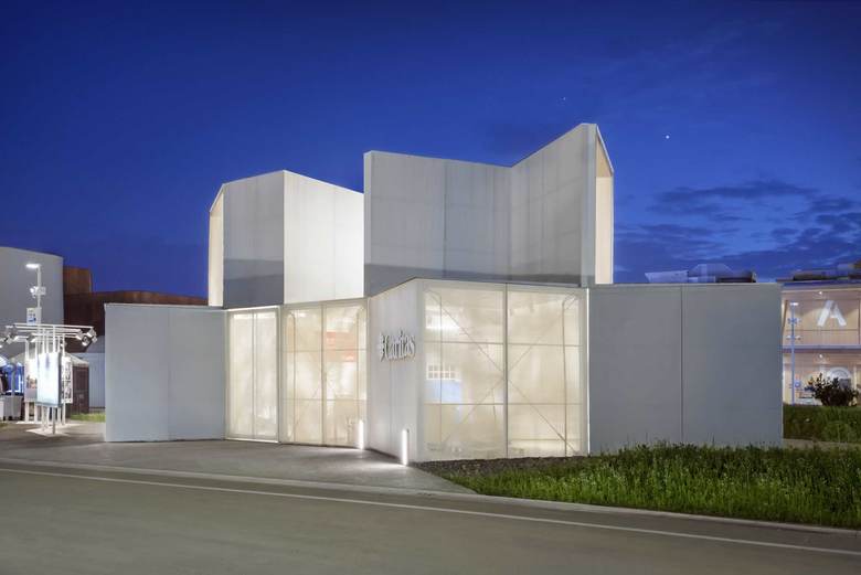 “Divide to multiply. Breaking the bread” is the theme represented in three dimensions in the pavilion with which Caritas takes part in the Expo; indeed, the architectural concept centres around the idea of sharing as an opportunity. The Edicola, this is the name of the small pavilion, has the appearance of a fragmented cube, the structure has been designed keeping simplicity at the core of its composition and the unadorned nature of its appearance. The structure is divided into 5 structures that are similar to each other but of different sizes and designed for different purposes. They are positioned on the ground and joined by vertices, a reference to the Edicola’s typical square floor plan. The uniformity of the construction is provided by its structural profile characterized by the same external dimensions, colour and materials. Thanks to its extremely simple structure, the Edicola is truly eco-sustainable. Externally, it is made of plastic pretensioned mesh that lets the air flow through without any need for air conditioning and lets in natural light which helps keep energy use to a minimum.