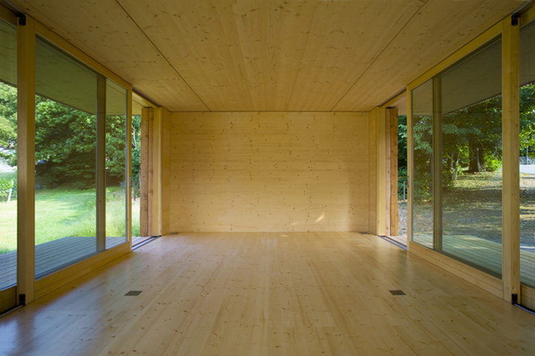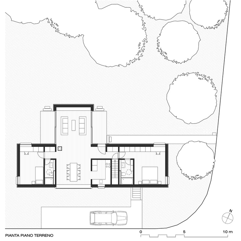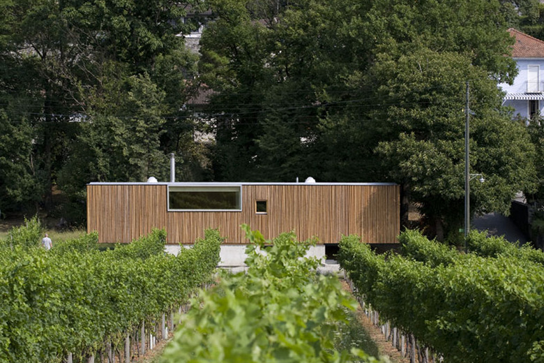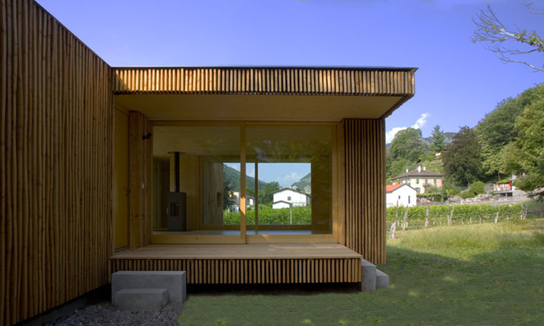 La parcella si situa a sud di un vecchio nucleo montano in pietra, in un vigneto pianeggiante oggi in gran parte occupato da case unifamiliari disperse nel verde. L’edificio s’inserisce nel quartiere come unità abitativa ad un piano, e, similmente ad un padiglione nel verde, è costituito da un volume compatto in legno che poggia parzialmente su uno zoccolo in cemento. Riprendendo il filo della strada di quartiere pianeggiante, la casa crea uno spazio aperto sul retro, verso nord, definito da un piccolo bosco di castagni.