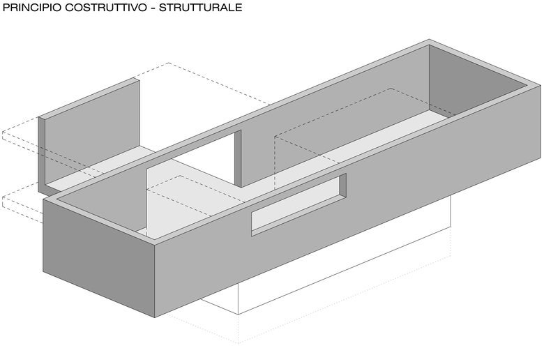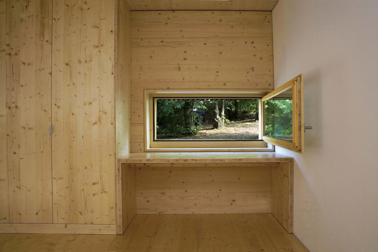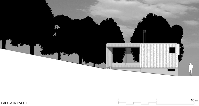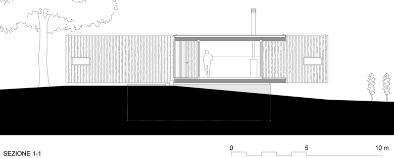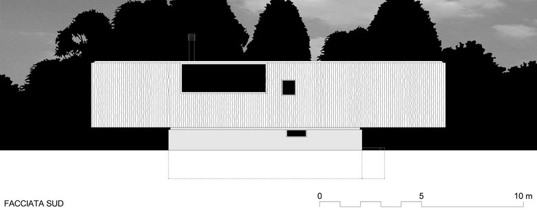 Il tema di progetto è una piccola casa a basso consumo energetico e basso costo per una coppia di pensionati che desidera ritirarsi nella natura. Lo spazio abitativo è organizzato su un solo piano in un corpo lungo, dove le due camere sono poste alle estremità. Al centro si situa il soggiorno che si estende verso l’esterno con una veranda dalle grandi finestre scorrevoli inserita nello spazio intimo formato dal boschetto a nord. Dall’interno un’unica finestra alta in corrispondenza del soggiorno si apre verso le montagne e il cielo a sud, consentendo allo sguardo di confrontarsi con l’orizzonte lontano. La leggera inclinazione della topografia resta invariata grazie allo zoccolo in cemento, che garantisce lo stacco dell’edificio dal suolo e quindi la continuità del paesaggio.