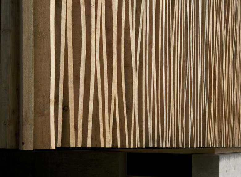 L’edificio è costituito da una costruzione prefabbricata in legno intelaiato, appoggiata su uno zoccolo in cemento armato. Il rivestimento viene eseguito in listelli verticali in larice recuperati dal taglio di tavole grezze: si tratta in tal senso di una facciata riciclata. L’irregolarità che ne consegue dà luogo ad un gioco di luci e di ombre. Soffitto, pavimento e gran parte delle pareti interne sono in tavole di abete, come pure i serramenti.