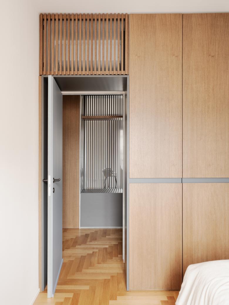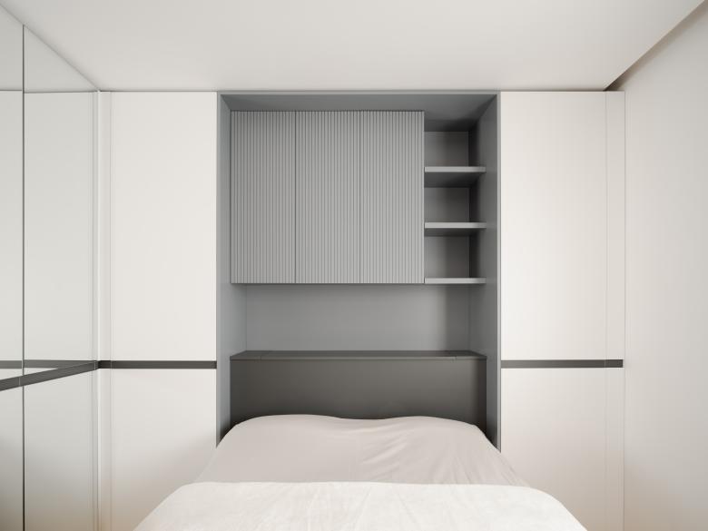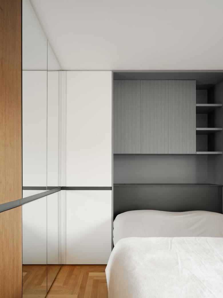 La camera padronale segue in armonia l’utilizzo cromatico dei materiali impiegati negli ambienti principali, essendo di superfici modeste è stato ottimizzato lo spazio contenitivo disegnando le pareti con armadiature a tutt’altezza su cui si innesta un letto contenitore con testata integrata.