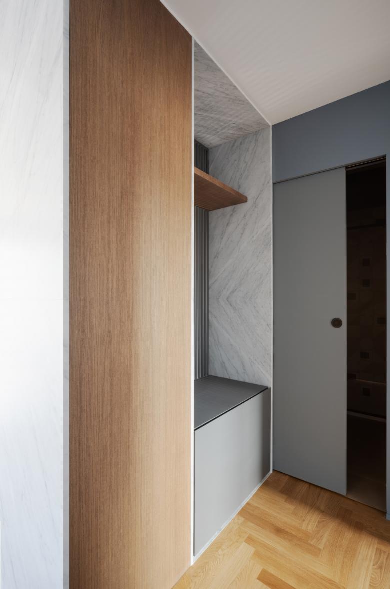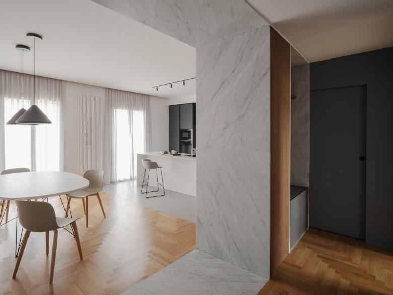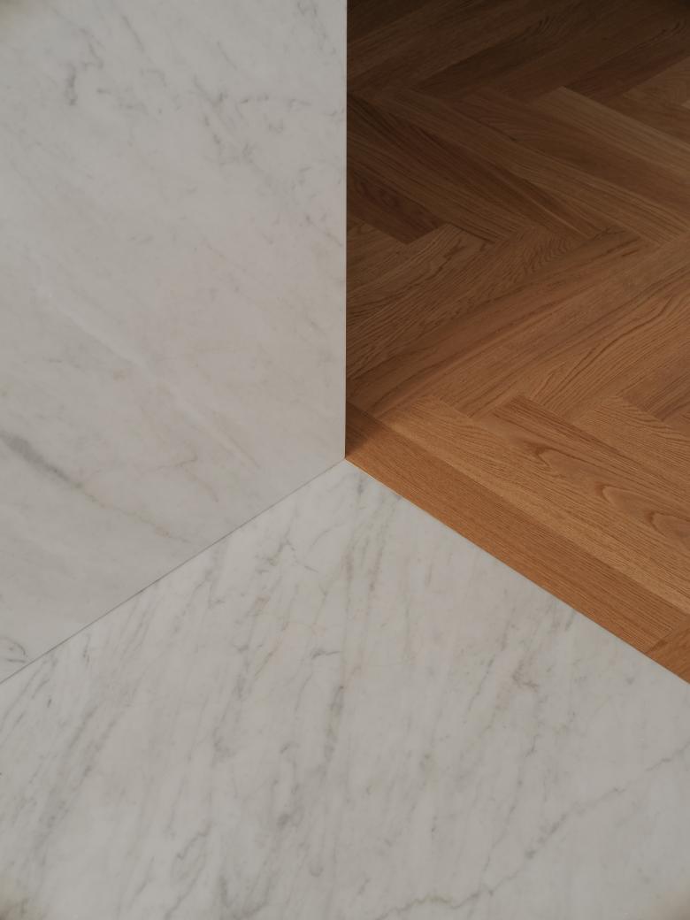 I materiali impiegati sono molteplici, il parquet a spina italiana si combina con il marmo creando dei cambi di pavimentazione, nei rivestimenti invece la pietra si affianca al rovere mordenzato e al legno laccato. I bagni sono rivestiti in ceramica utilizzando dei formati piccoli ma dal forte impatto visivo e dal gusto “rétro”.