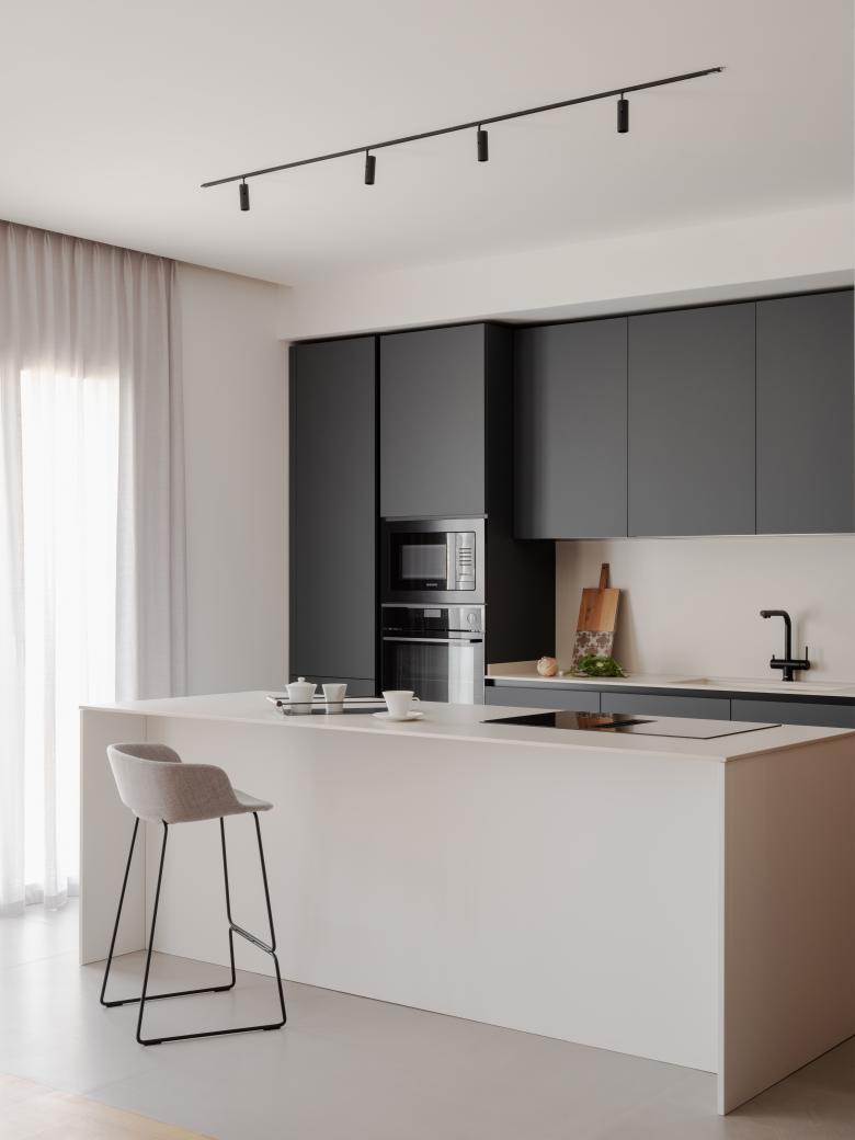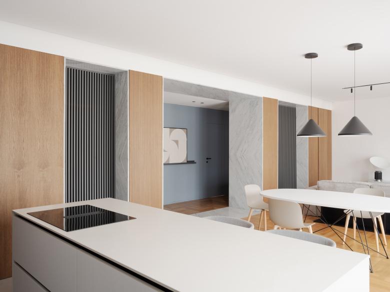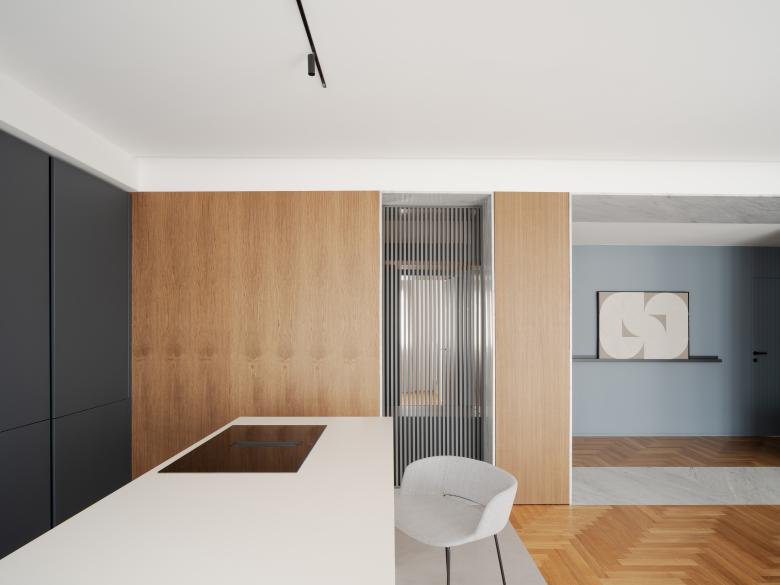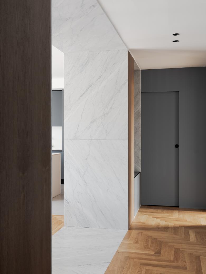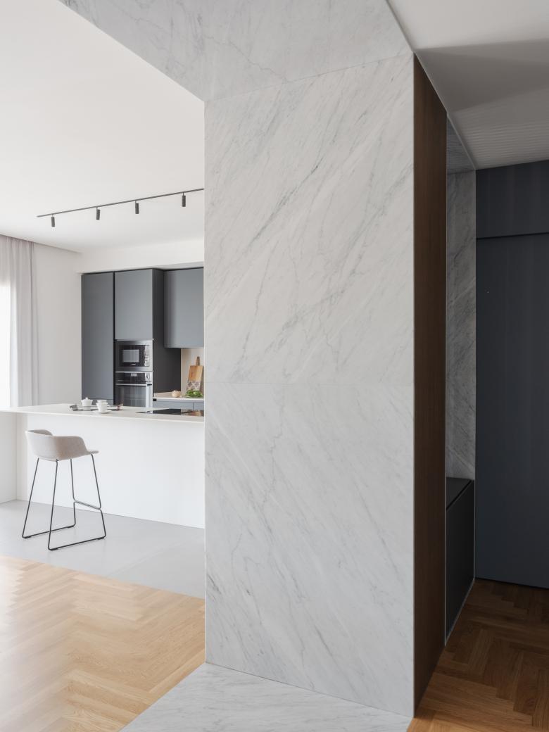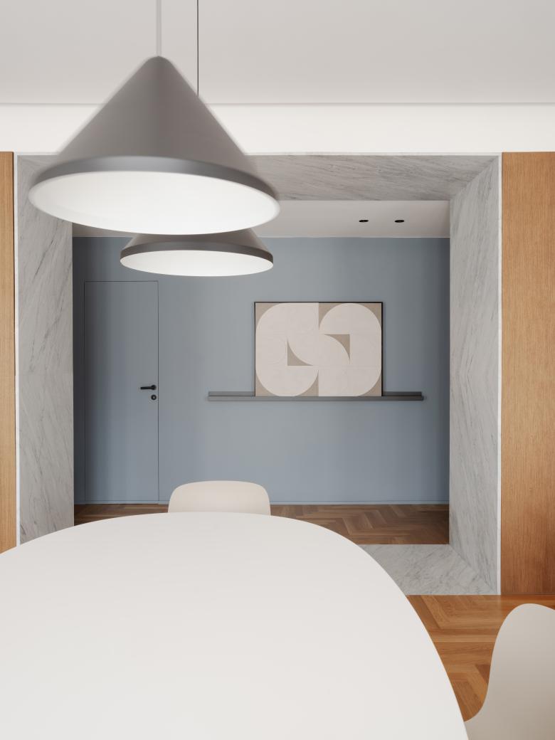 L’immobile è di fine anni sessanta, la pianta circa 110 m² prevedeva una classica distribuzione a pettine degli ambienti risultando molto distante dalle esigenze dei committenti. La struttura intelaiata della casa ha permesso una grande libertà nel riorganizzare gli spazi, prevedendo un grande living, principale richiesta della committenza, oltre a due camere da letto con i relativi servizi. La ricerca spaziale si focalizza però nello spazio di distribuzione: Le tramezzature vengono abolite, ma lo spazio connettivo mantiene una sua percezione fisica attraverso dei sistemi su misura che filtrano lo spazio conviviale e diventano sistema attraverso l’inserimento di portali in marmo di Carrara, dei “gates” ornamentali e di transizione fra zona giorno e notte, le pareti hanno un colore ceruleo a marcare un cambio di dimensione e generano uno sfondo su cui il living contrasta in maniera netta.