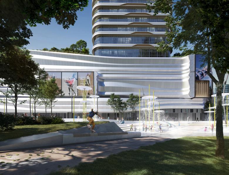 The scheme’s retail circulation ties together its three sections and main entrances via an enclosed loop on the second floor, with link bridges to the adjacent residential development and park. Moreover, it provides a unique walking experience by generating spaces along the outdoor retail street and indoor shopping mall arcade that can host various events.