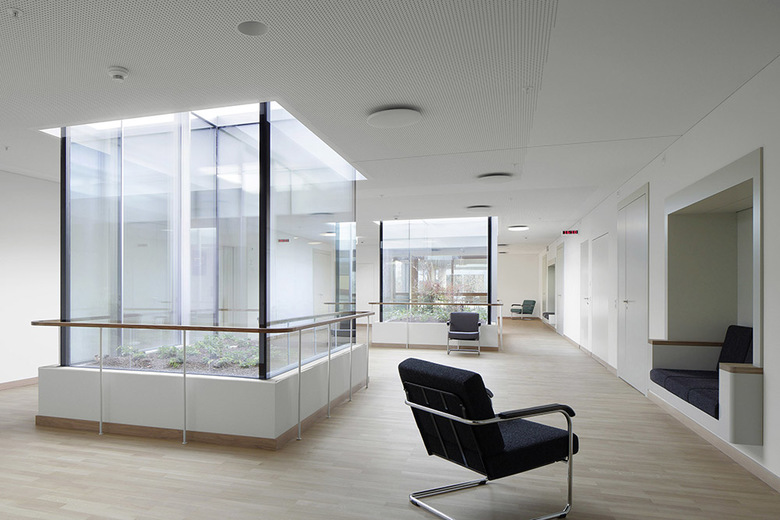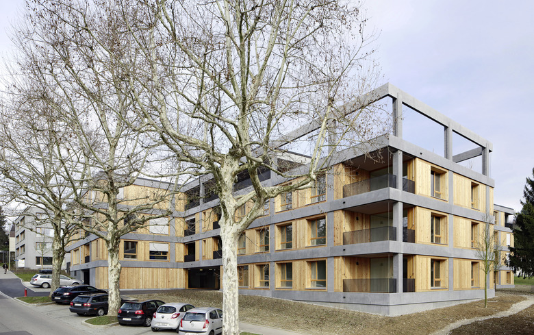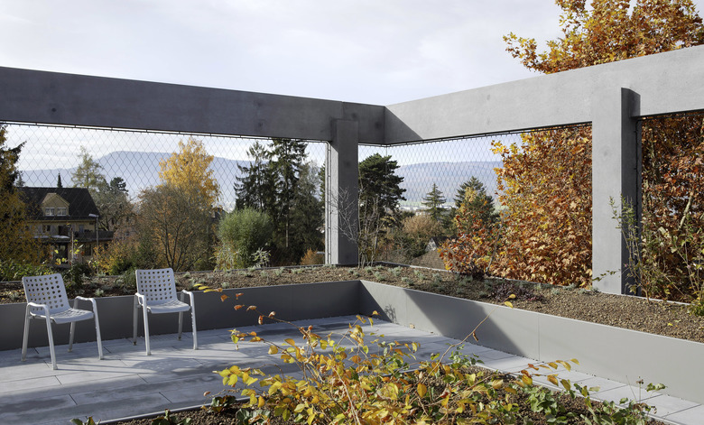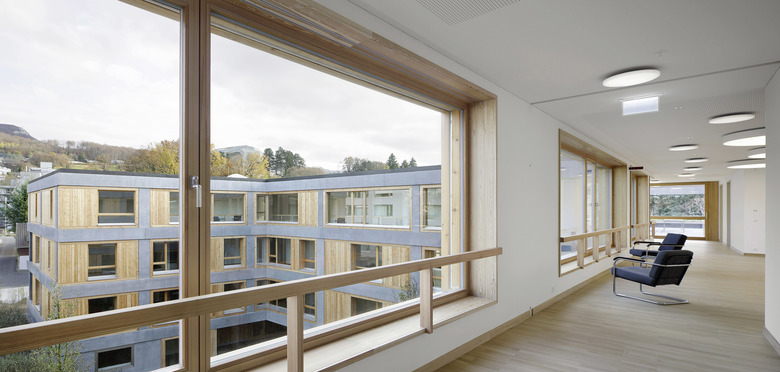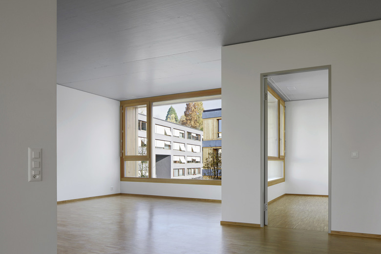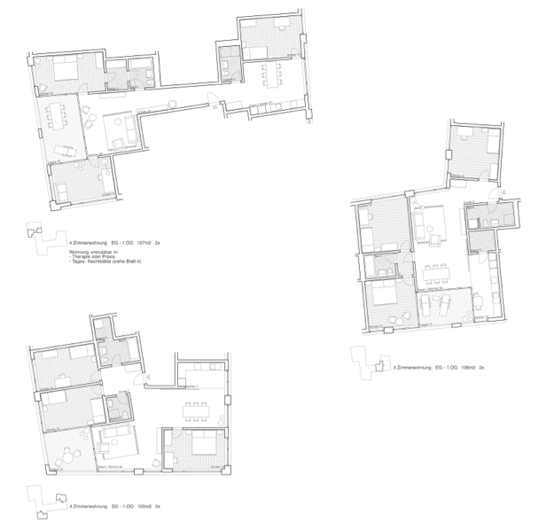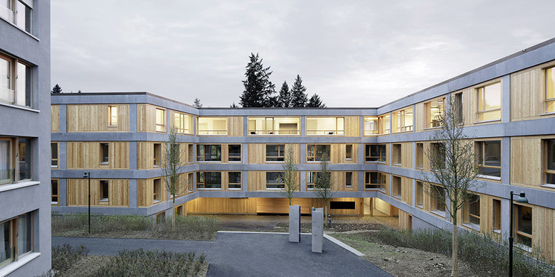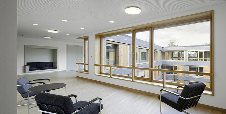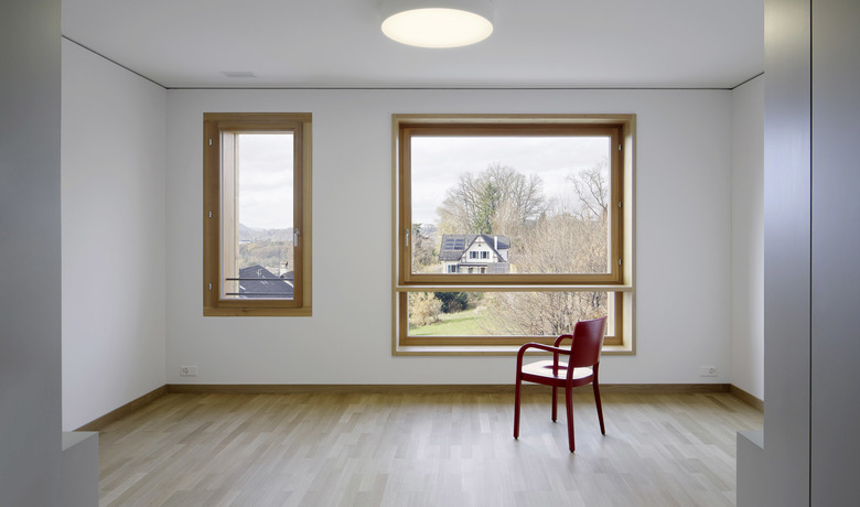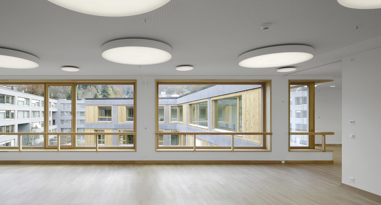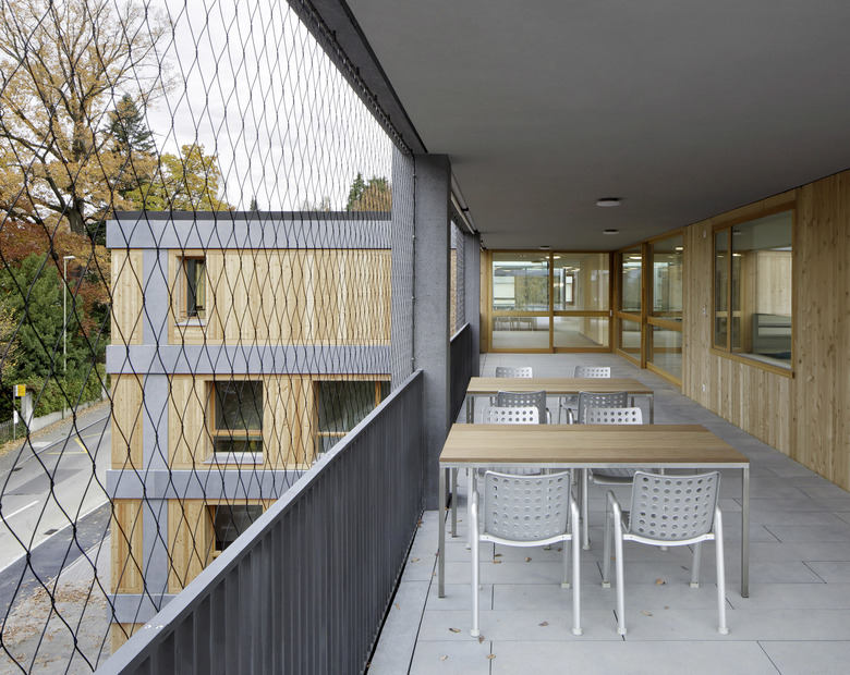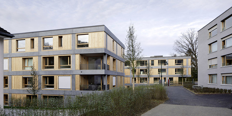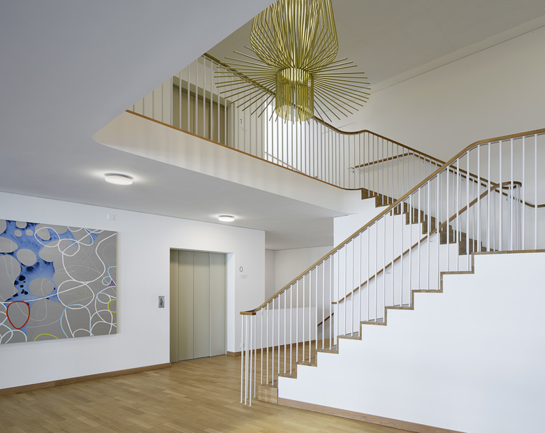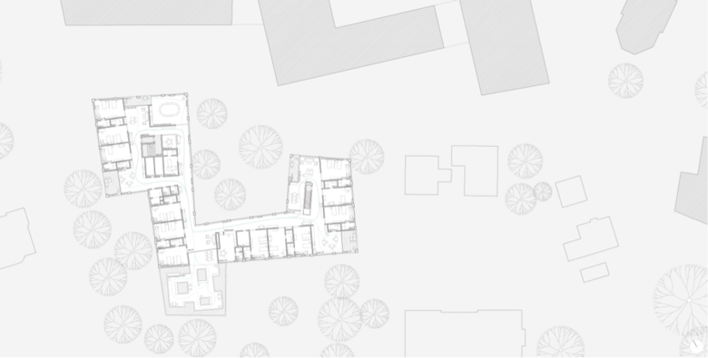Das vom Gelände und den bestehenden Gebäuden mitgeformte Neubauvolumen vermittelt zwischen dem sich entlang der Höhenlinie ausstreckenden Volumen der Alterswohnungen und den auf unterschiedlichen Niveaus stehenden Einzelvolumen des privaten Wohnens. Das gesamte Raumprogramm (Demenzabteilung und Familienwohnungen) wird in einem Gebäudekörper zusammengefasst. Dies ermöglicht den Bereich für die leichte bis mittelschwere Demenz als autonome, kleine, allseitig orientierte Welt auf dem obersten Geschoss mit angegliedertem Demenzdachgarten zu organisieren. Die rundlaufbildende Raumfigur des Erschliessungs- und Aufenthaltsbereiches folgt dem Bewegungsdrang der Bewohner.