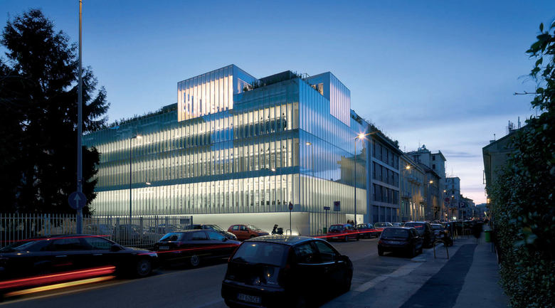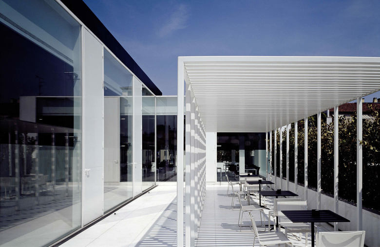 Situated just a few hundred metres from Corso Buenos Aires, the Dolce&Gabbana offices and showroom in via Broggi, Milan, is a combination of classical and contemporary, smoothly interacting with the surrounding cityscapeThe 1920s’ building, used for offices and reception spaces, is enhanced by focusing on its architecture and maintaining its elegant, classical style. The 1960s’ building, used as a showroom, has been completely hollowed out to create a 3-storey open space crowned by small terraces constructed out of the restaurant structures. It completely changes skin on the outside, cladding itself with glass in a very tightly-knit modular pattern. This gives it a much more contemporary feel, which seems to create a subtle line of rupture between the two buildings, whereas it is merely a junction line. The glass structure turns into an almost immaterial prism, thanks to the choice of reflective materials (glass and shiny steel sheets) enveloping it in an aura of eclecticism by means of simple forms described by the effects of shadow and light during the day. The building creates a large front of diffused light offering glimpses of garments from the fashion house’s collection, which run along the perimeter of the façade. The building’s transparency opens it up to the city and passers-by, stitching it back together with the neighboring building. Transparency emerges from the façade design featuring a regular pattern of vertical sunscreen shutters made of opaline glass, partly inspired by a work by the British artist Damien Hirst entitled “Some Comfort Gained from the Acceptance of the Inherent Lies in Everything” from 1996. Hirst showcases the bodies of two cows. In the same way, Piuarch seems, at least on the outside, to be sectioning the showroom’s large open spaces into lots of separate windows, focusing on every individual item of clothing from the collection in via Broggi.