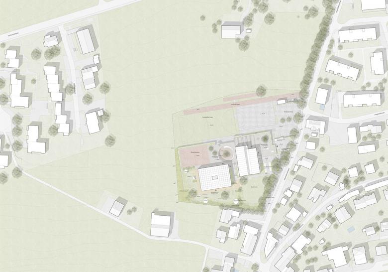 Die Erweiterung dehnt das vorhandene Hallendach mit Schulhof zum grossflächigen „Schul-Plateau“ in die Landschaft aus, aus dem heraus altes und neues Schulhaus aufragen. Der künstliche Sockel nimmt mit den Sporthallen, Foyers und Zuschauerbereichen, Mehrzwecksaal und Bibliothek die öffentlichen Nutzungen auf und verbindet Alt- und Neubau über einen zentralen Hof auf Ebene UG1. Sein grosser, kreisrunder Deckenausschnitt verbindet ihn mit der Erdgeschoss-Ebene des nun über beide Gebäudeteile hinweg erweiterten Schulhofs mit Allwetterplatz auf dem Dach der neuen Turnhalle. Oberhalb des befestigen Pausenplatz-Horizonts stehen das alte Schulhaus der 5. + 6. Klassen und das neue Schulhaus mit den Kindergärten im EG und den Primarschulklassen 1 - 4 im OG als eigenständige Gebäude nebeneinander, umgeben von den umlaufend ausgestalteten Pausenplatz- und Grünanlagen der Schulnutzung.
