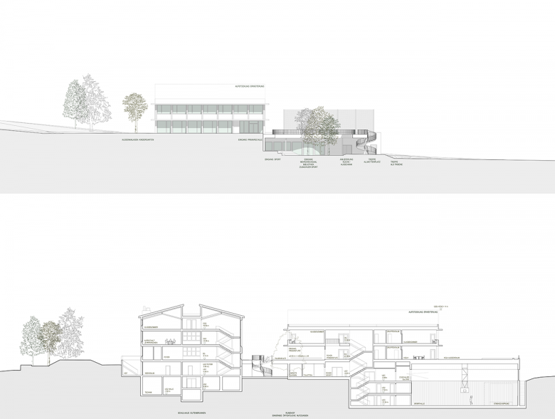 Für eine nächste Etappe zur Erweiterung der Schulräume bietet sich an, das neue Schulhaus analog zum bestehenden Schulhaus ebenfalls um ein Dachgeschoss vollflächig aufzustocken. Durch die Verteilung der Nutzungen und die Disposition von vertikaler Erschliessung und Sanitärzonen ist der konfliktfreie Gebrauch durch verschiedene Nutzer möglich. Die Erweiterung schreibt dazu die schon im Bestand angelegte Schichtung des Raumprogramms fort: Sporthalle, Zuschauerfoyer, Mehrzwecksaal mit Küche und auch die Bibliothek im neuen „Sockelbau“ sind unabhängig vom Schulbetrieb zu nutzen. Durch die Konzentration der Kindergärten im EG des Neubaus sind die Werkräume im UG und EG des Altbaus nun ebenfalls unabhängig vom Schulbetrieb erschlossen und nutzbar … eine „öffentliche“ Zone läuft unterhalb der Schulhäuser durch und kann unabhängig von deren Tagesablauf betrieben werden.