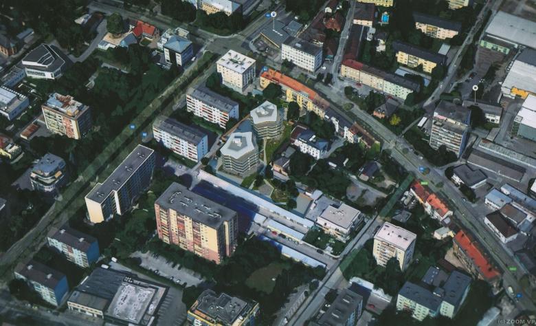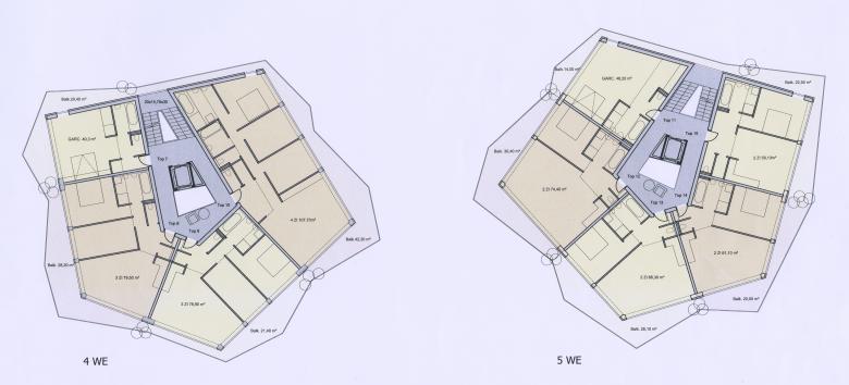 Vor Ort gefundene Blätter eines Strauches, die ihre Zacken dem Sonnenlicht entgegenstrecken zu schienen, standen als eine Inspiration des Projektes. Die lokale Bauordnung schreibt bei einer Seitenlänge von mehr als 18 m , die parallel zur Grundstücksgrenze liegt, die gesamte Höhe als Grenzabstand vor. Geht eine Bebauungskante größer als 45 Grad von einer naheliegenden Grundstücksgrenze weg, zählt sie nicht zur Länge des Gebäudes. So waren es dann auch pragmatische Parameter, die das Fünfeck in vielerlei Hinsicht als vorteilhaft auszeichneten. Es ist mehr Fläche zur Sonne im Süden und der dortigen Bergsicht exponiert, als dies beim Kubus der Fall wäre. Zudem ist die Fassadenfläche bei gleicher Grundfläche eines Fünfecks, auch noch merklich geringer . Zwischen dem zentralen Kern und der Außenwand, ist ein stützenfreier Grundriss möglich, der eine beliebige Wohnungsteilung mit leichten Trennwänden ermöglicht .Raumhohe Verglasungen mit Schiebetüren und mit Balkonen vor allen Räumen generieren ein freies Wohngefühl, der Ausblick ist frei auf die Bergkulisse und den verschieden, am Grundstück angelegten, typologischen Gärten. Der Blick wird auch ist nicht blockiert durch eine parallele Nachbarfassade, sondern streift tangential an den Gebäuden vorbei.