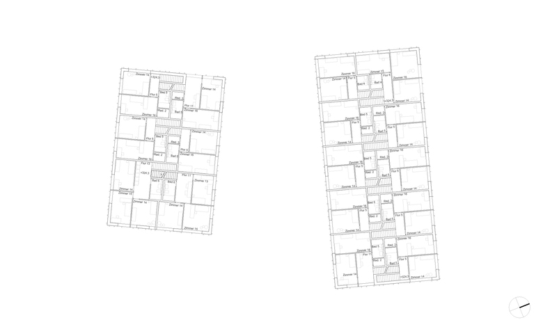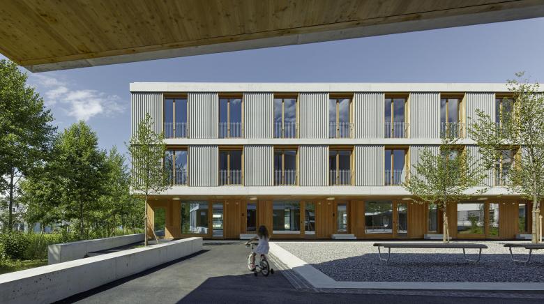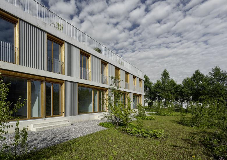 Die Mietwohnungen werden durch die eigene Adresse, ihrer mehrgeschossigen Typologie mit eigenem Gartenanstoss oder begrünbarem Attikaanteil zum „Mieteinfamilienhaus“. Die kompakte Organisation der Grundrisstypen ermöglicht das Einhalten der gewünschten Wohnungsgrössen. Die erdgeschossigen Aussenräume der „dem Platz“ abgewandten Seite bilden den Wohnungen zugeordnete private Gartenräume. Entlang dem Siedlungseingang wird der Gemeinschaftraum angeordnet. Der Gebäudehülle in Holzmodulbauweise wird ein Rankengeflecht vorgelagert. Dieses Gitter prägt die Erscheinung des Gebäudes und fasst die zum Platzbereich liegenden Aussenräume des Attikageschosses räumlich ein. Es bildet ein mögliches Rankengerüst für Kletterpflanzen. Die Gebäudehülle wird somit örtlich Teil des umgebenden Gartenraumes und ermöglicht den oberen Wohneinheiten eine Begrünung des Dachgartens.