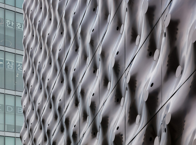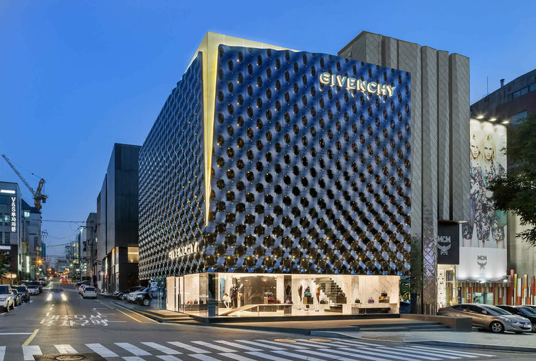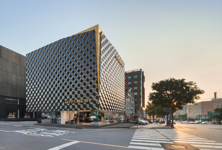 A building covered by a skin of dark coloured sheets of steel that changes with the light and rests on a glazed base revealing minimalist-style interiors: the new Givenchy Flagship Store in Seoul is a dynamic structure generating varying optical effects. Designed by Piuarch in partnership with the cerative director of the French fashion house, Riccardo Tisci, the new Givenchy space is located in the prestigious Cheongdam ward of Gangnamgu shopping and fashion district of Seoul.