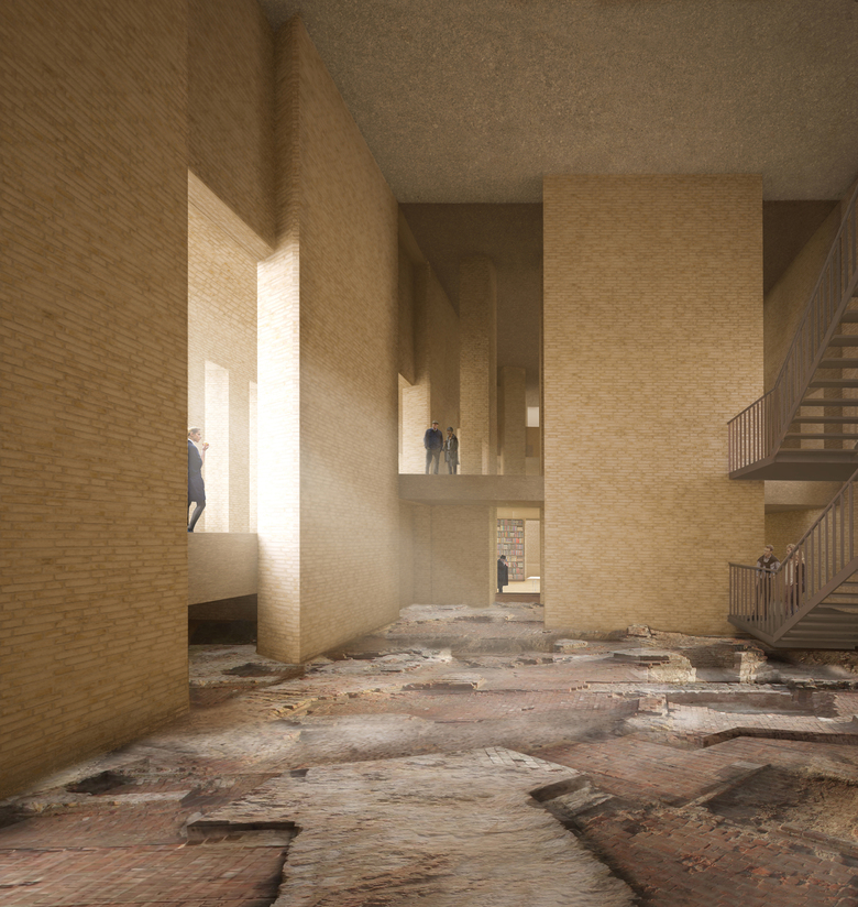 Der Petriplatz als religiöser Ort im Zentrum der Stadt reicht zurück bis ins frühe Mittelalter. Insgesamt fünf Petrikirchen wurden hier nacheinander errichtet. Die letzte Petrikirche wurde im Zweiten Weltkrieg beschädigt und 1964 abgetragen. Das House of One transformiert den Petriplatz, in dem es seine Geschichte in einem sehr wörtlichen Sinn fortschreibt statt ihn zu musealisieren: Das Bauwerk wird nicht nur ideell am Ort der früheren Petrikirchen errichtet, sondern verbindet sich unmittelbar physisch mit den archäologischen Fundamenten der letzten Petrikirche.