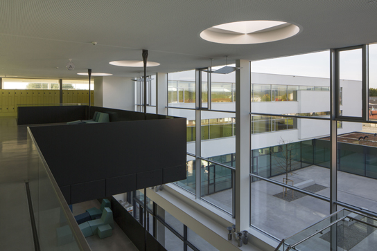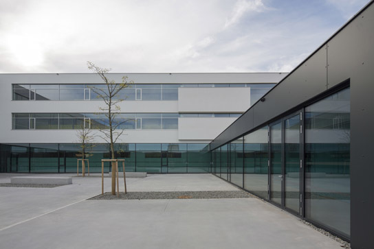 The project was developed after winning an EU- wide competition and has been finished in 2012. Open spatial sequences provide the base for a state of the art learning environment. The entrance to the school is formulated as an atrium connecting all floors to one communication area. The three- storey L- shaped school building serves as a natural noise protection and defines a courtyard together with the L-shaped workshop area on the ground level – in cooperation with AT4Architekten.