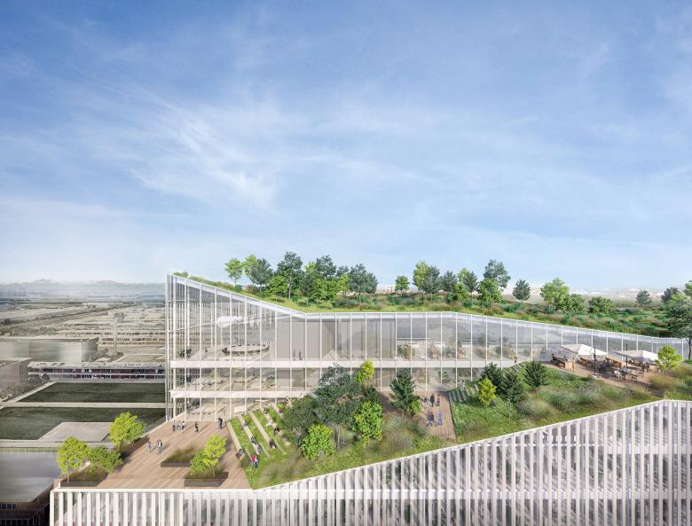 The roof garden is the natural complement to the covered plaza: here, the introverted “vertical campus” opens onto its surroundings and the city and the characteristic broken profile of its crown makes the Human Technopole Headquarters highly recognizable, a new architectural icon for the future MIND. Set around the backbone of these three public and collective spaces are the offices and laboratories of the Human Technopole Headquarters, arranged in two distinct compact blocks, both parallel to the covered plaza. The Human Technopole Headquarters is conceived as a highly sustainable ecosystem. The greenery-covered areas at ground level and on the roof allow the correct management of rainwater. The photovoltaic systems installed on the shelters on the ground floor, on the facade and on the roof contribute significantly to the building’s energy needs. The angled sun shades along the façades calibrate the amount of sunlight entering in the different seasons of the year.