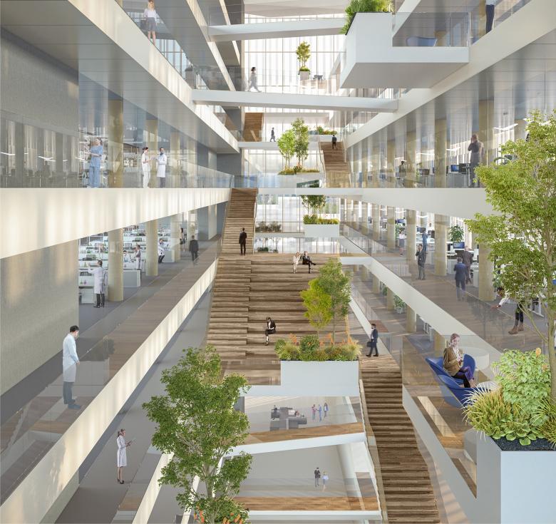 A parterre, a covered plaza and a roof garden: Piuarch’s design is organized around these three spaces, which form an uninterrupted sequence from the ground floor up to the top of the building. At ground level, the parterre connects the Human Technopole Headquarters with the other buildings of the Campus, including Palazzo Italia. An artificial landscape of inclined planes suggests a distinction between the movement areas and the rest areas, the amphitheaters. This open space, which in part also continues under the building, provides access directly to the fully glazed atrium, and from there to the covered plaza. The latter is the true heart of the Human Technopole Headquarters, on a functional, relational and symbolic level. On the one hand, this gigantic, full-height empty space, flooded with natural light, is crossed by a system of ramps and walkways that connect all the building levels. At the same time, the covered plaza, which is overlooked by all the offices and laboratories, is a crucial space for interaction and the exchanging of ideas.