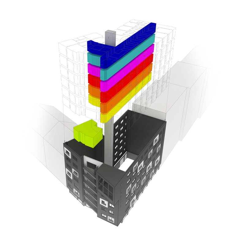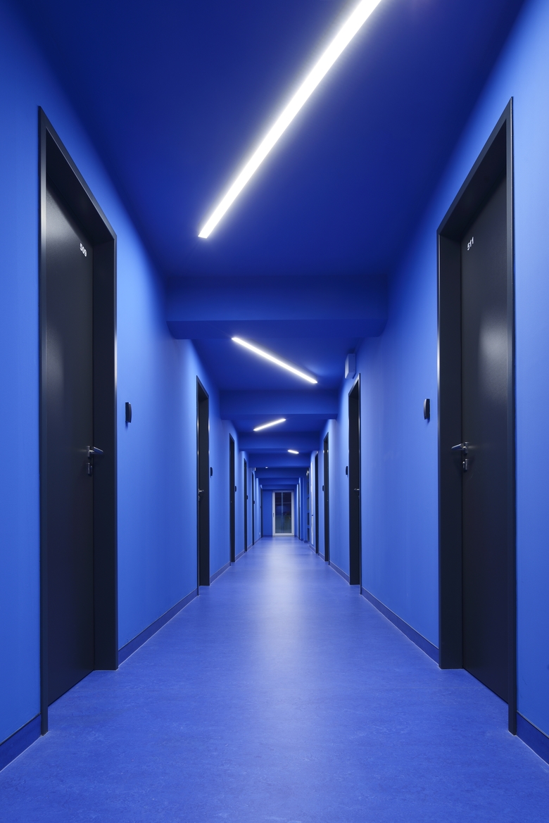 The basic concept of the building consists of two main parts. The façade including the rooms behind create the ‘skin’ of the building, a neutral black-and-white exterior envelope, while the corridors and stairways are the building’s ‘arteries’. Invigorated with rich colours they become a vivid communication hub. The corner position of the building is highlighted on the top by a new double-floor oriel featuring study rooms – the knowledge centre of the building.