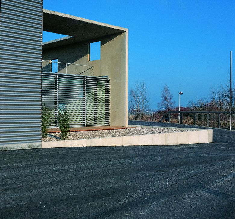 Werksanlage für die Extrusion von Kunststoffprofilen. In Form überdimensionaler Container sind die Teilbereiche Verwaltung, Lager und Logistik wie Satelliten an die zentrale Produktionshalle angedockt. Vorgefertigte Elementbauteile aus Beton und Industrieglas verleihen der Collage aus unterschiedlichen Funktionen ihr funktionales Erscheinungsbild. Ein Einschnitt im Verwaltungskubus dient als Dachterrasse und Erweiterungsoption.