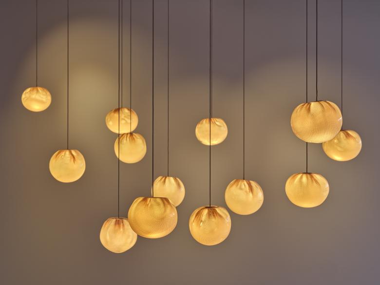 Im Essbereich hängt eine Gruppierung von Kugelleuchten aus mundgeblasenen Glaskugeln mit eingelassenem Kupfernetz, das den Leuchtkugeln Wärme verleihet. Die spielerische Anordnung und unterschiedlichen Pendelhöhen wurden so gewählt, dass eine flexible Anordnung auch bei größeren Feiern mit erweitertem Tisch und eine angenehme gemütliche Beleuchtung behalten bleibt.