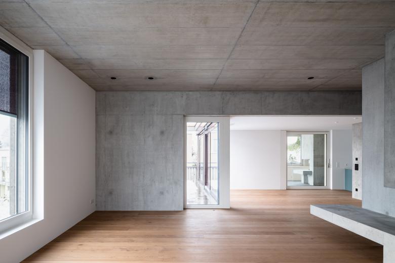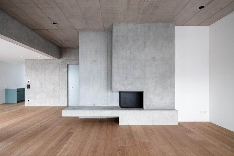 Das Zweifamilienhaus liegt in reizvoller, ländlicher Umgebung am Rande der Stadt St. Gallen mit Blick ins Appenzellerland. Der Ausblick sowie der Bezug von Innen- zum Aussenraum dienten als wichtige Gestaltungsbezüge. Das Wohnhaus besitzt Vor- und Rücksprünge, welche unterschiedliche Ausblicke in die Umgebung ermöglichen. Im Zentrum der beiden Geschosswohnungen steht jeweils ein betonierter Cheminéekern, um welchen sich die Zimmer anordnen. Die Wohnung im Obergeschoss besitzt ein überhohes Wohnzimmer mit einem präzis gesetzten grossen Eckfenster mit Blick in die appenzeller Hügellandschaft. Die Innenräume sind geprägt von natürlichen Materialien wie Sichtbeton, Weissputz und Eichenparkett. Die Aussenhaut besteht aus einer dunkel lasierten Bretterschalung. Der linke, niedrigere Hausteil, in welchem sich Jahreszeitenzimmer, Neben- und Aussenräume befinden, ist farblich leicht vom Hauptgebäude differenziert.