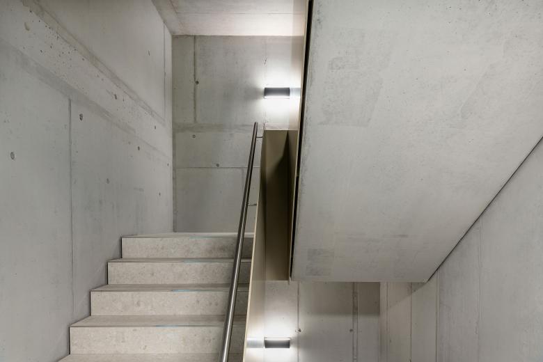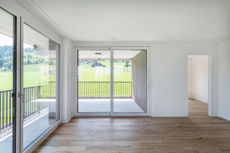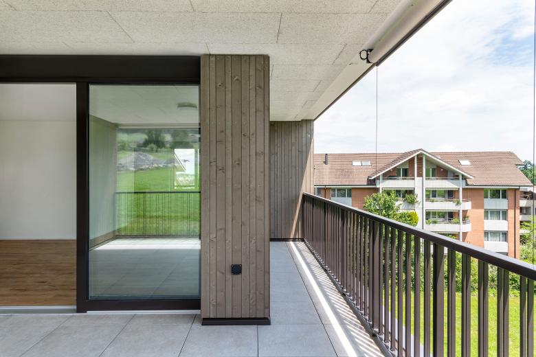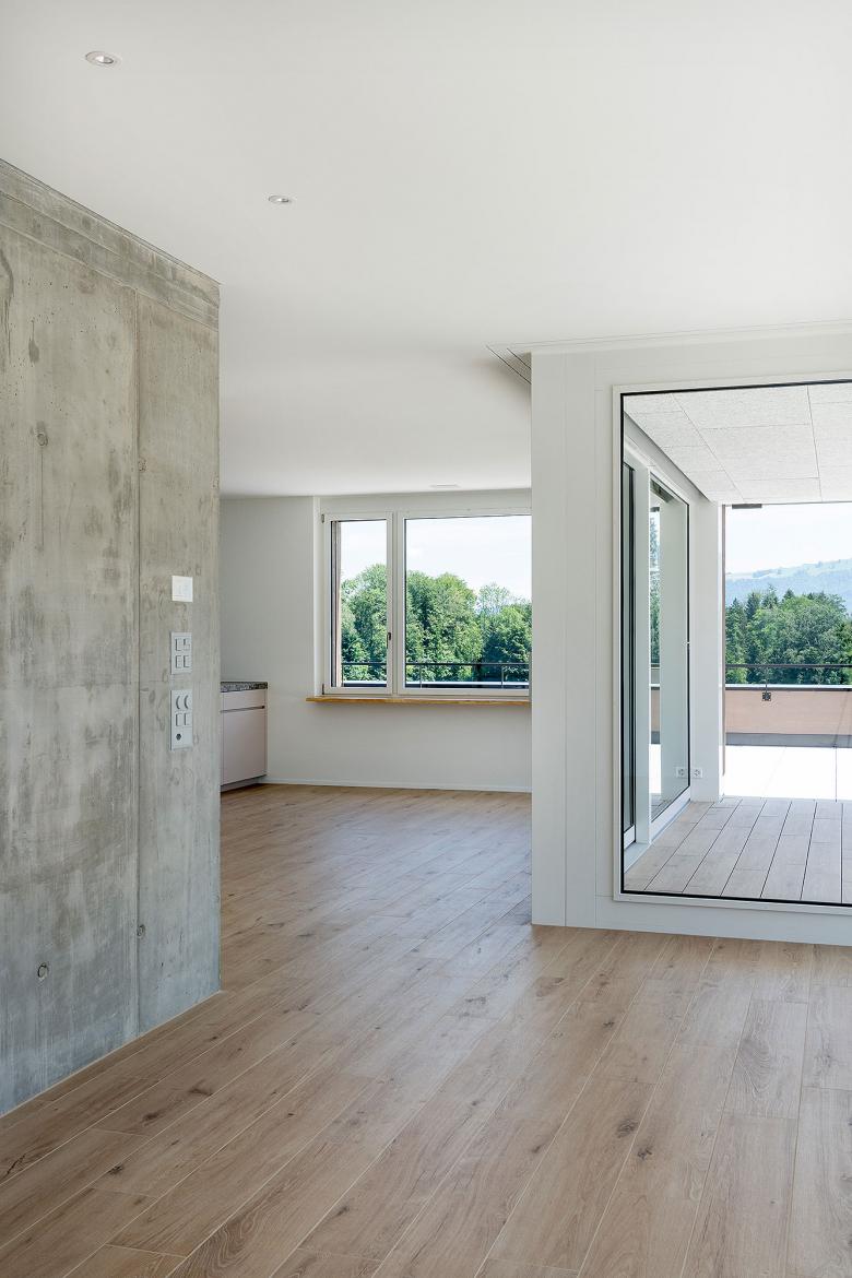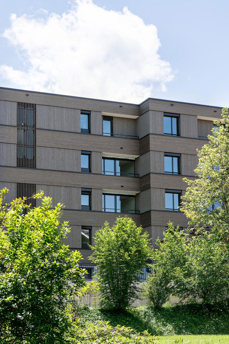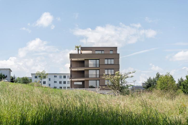 Die erhöhte Lage des Grundstücks ermöglicht nordseitig einen Blick bis ins Dorfzentrum sowie südseitig eine freie Sicht auf die angrenzende Landwirtschaftszone. Als Siedlungsauftakt sowie auch als Abschluss, bekommt die Bebauung eine prominente Doppelfunktion. Der Übergang von der Wohn- in die angrenzende Landwirtschaftszone beeinflusst die Setzung sowie die architektonische Gestaltung des Neubaus massgeblich. Der Zeilenbau reagiert mit seiner einfachen und klaren Grundform auf die umliegende Siedlungsstruktur. Den benachbarten Quartierbauten verwandt, wird die längliche Volumetrie der Zeile durch einen Versatz leicht strukturiert. Die beiden aneinandergereihten Zweispänner werden mit unterschiedlichen Wohnungstypen bespielt. Alle Wohnungen weisen grosszügige und gut möbelierbare Grundrisse auf und sind durch die Reduktion von Korridorflächen sehr effizient organisiert. Das Grundstück wird durch den Zeilenbau in eine Nord- und Südseite unterteilt. Talwärts entwickelt sich in nördlicher Richtung der gebaute Siedlungskontext, wohingegen in südlicher Richtung die Landwirtschaft dominiert. Das Umgebungskonzept reagiert auf die unterschiedlichen Einflüsse der angrenzenden Aussenräume.