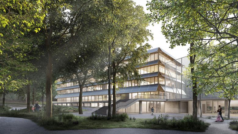 "Schulhaus im Wald“ – Keiner der heute vorhandenen, mächtigen Bäume soll für das neue Schulhaus fallen ... das Areal Goumoëns unter dieser Annahme massiv zu bebauen, gibt ein anderes Baufenster vor als in früheren Studien, die primär vom Lärm der Bahngleise her argumentiert haben.