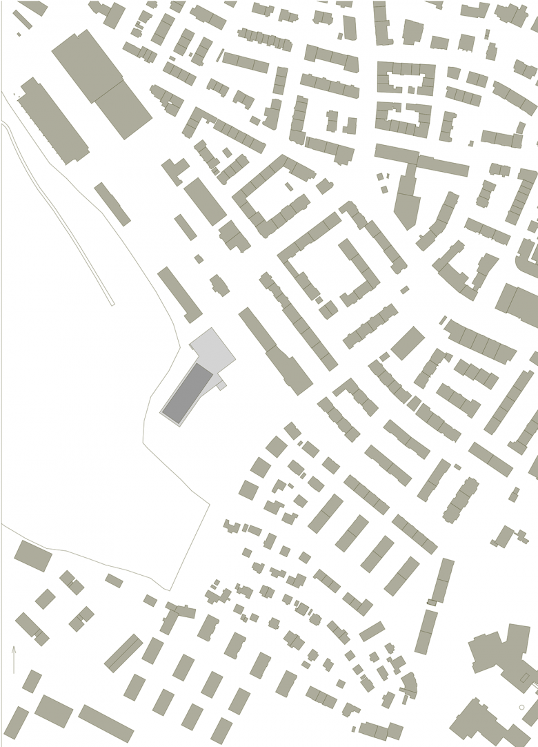 Der gegenüber der Goumoënsstrasse an den äussersten Rand der Parzelle verschobene Neubau erhält den Grünraum in seiner heutigen Ausdehnung und verschafft dem Schulhaus eine entspannte Eingangssituation: Die bauliche Konzentration der Flächen ermöglicht Schule wie Nachbarschaft divers nutzbare Aussenraumflächen, die mit ihrem Baumbestand grosses Potential haben für sehr unterschiedliche und auch kleinräumige Nutzungen. Der Neubau entwickelt aus der von Westen nach Osten hin abfallenden Topographie eine horizontale Plattform auf der Kote 554m üNN – ähnlich einem grossen Tisch. Diese künstliche Ebene ragt zum Bahntrassee hin als eingeschossiges Sockelgebäude aus dem Boden. Am andern Ende, zur Gummere-Matte, hebt sie als umlaufendes Deck das darauf abgestellte, eigentliche Schulhaus nur knapp übers gewachsene Terrain.