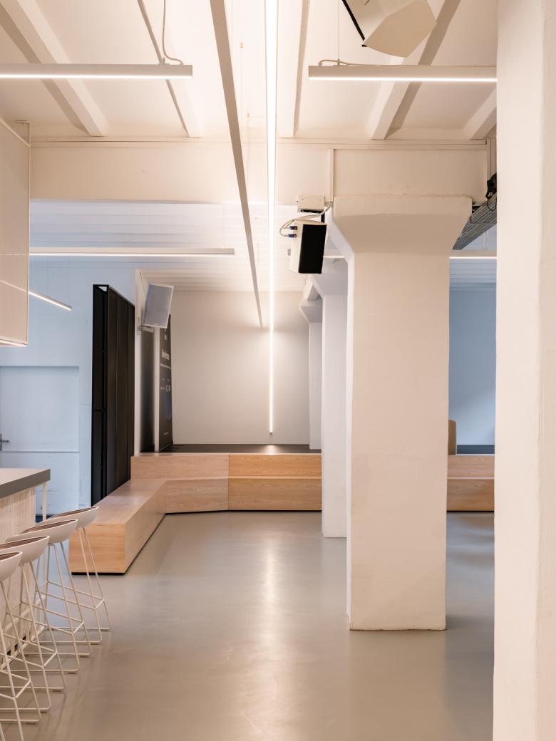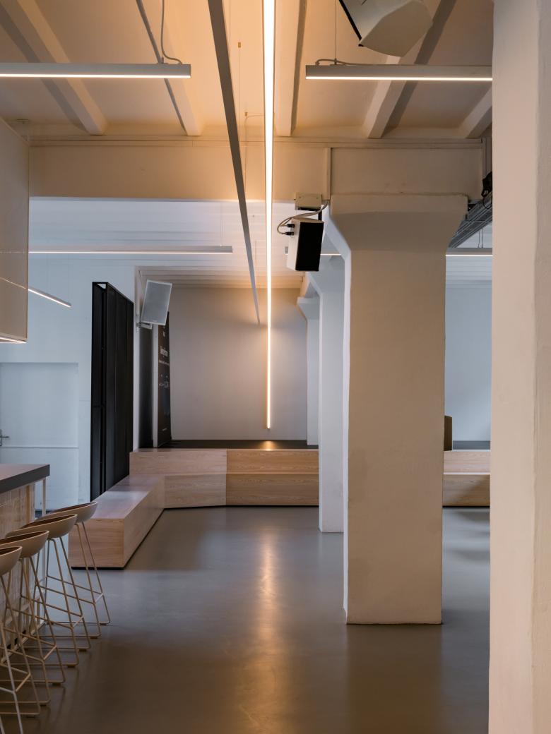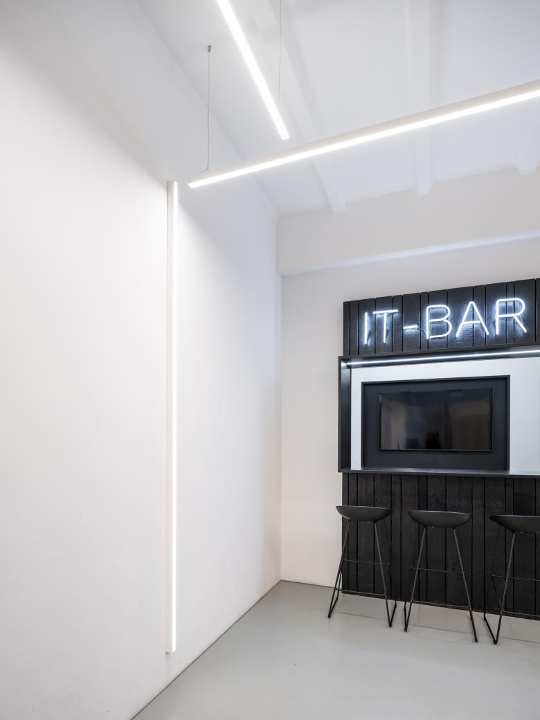 Die Lichtplanung dieser Büroetage fokussierte sich in erster Linie auf eine minimalistische Lösung, geprägt von Klarheit und Einfachheit. Die grafischen Beleuchtungselemente sind nicht nur funktional, sondern verleihen den Räumen auch eine gestalterische Sprache und verbindet die verschiedenen Bereiche wie Wartebereich, Bühnen, Co-Working Bereich, Bar oder Empfang.