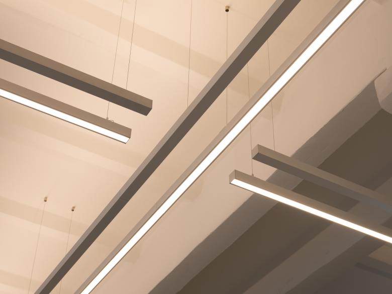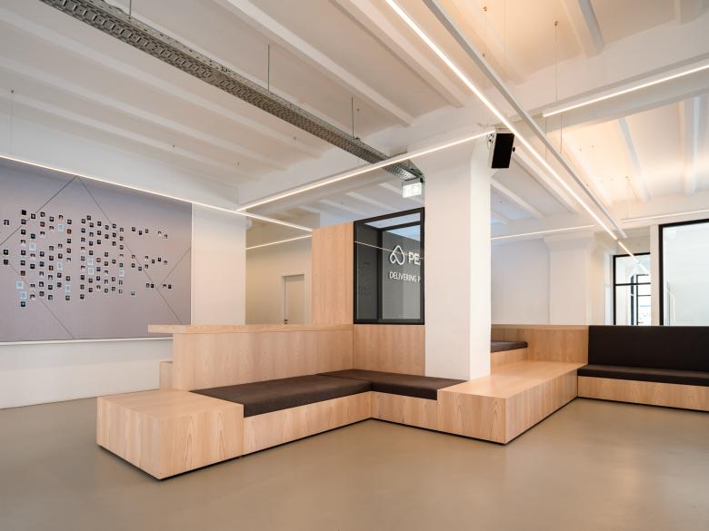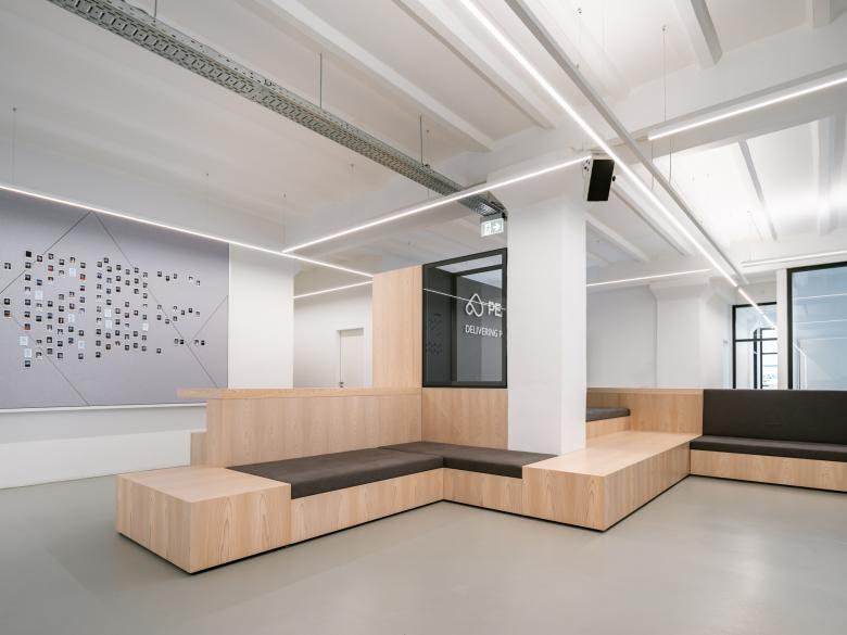 Die besondere Deckenkonstruktion sowie die ungeraden Wände und Decken des Altbaus waren eine Herausforderung für die Ausführung und Planung der Beleuchtung, die durch ein flexibles Leuchtensystem, genaue Koordination der Montagepunkte und das Zuschneiden der indirekten Abdeckung vor Ort gelöst wurde. Auch die vielseitige Nutzung von Arbeitsbereichen bis hin zu Kundenempfängen und Events stellte spannende Herausforderungen dar. Die Lösung ist eine vollständig steuerbare Lichtlösung, die Bereiche und Atmosphäre auf Knopfdruck durch vorprogrammierte Szenen verändern kann.
