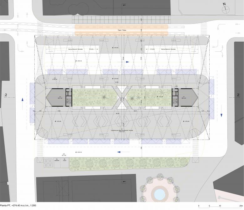 La copertura si appoggia su due volumi edili che contengono le funzioni richieste, su tre livelli (biglietteria TPL e ARL, polizia comunale, spazi commerciali …). Il vuoto centrale permette una relazione verticale tra gli elementi.