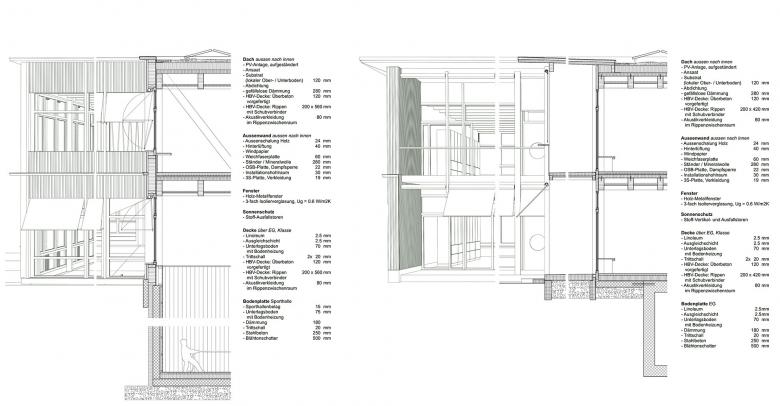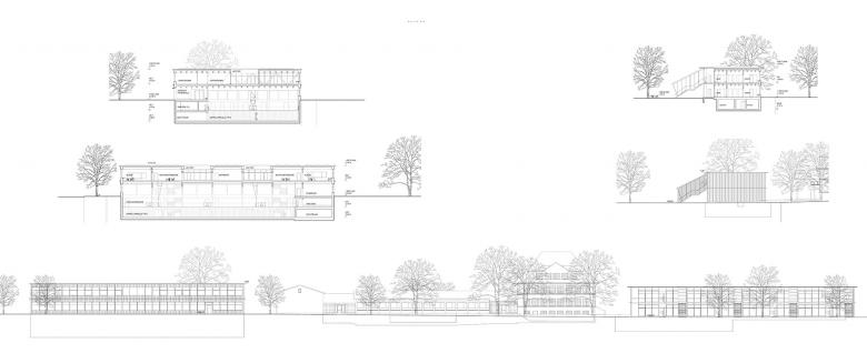 Die neue Doppelturnhalle wird am südwestlichen Ende des Areals um zwei Geschosse ins Terrain versenkt. Der Luftraum der Halle ragt ins umlaufend verglaste Erdgeschoss mit gedeckter Pausenhalle und den Musiksälen. Zwei Treppenhäuser erschliessen ab der Pausenhalle mit je eigenen Zugängen die beiden Cluster der 3. + 4. Klasse und der 5. + 6. Klasse im Obergeschoss sowie die getrennt nutzbaren Hallenteile im Untergeschoss. Oben legen sich beide Cluster mit jeweils 4 Klassenzimmern um eine grosszügige Multifunktionszone. Zwischendrin Lehrerzimmer mit Schulleitung und der Informatikraum. Drei kleine Innenhöfe bringen Tageslicht in das raumhaltige Fachwerk aus Holz oberhalb der Halle und erweitern die dortigen Unterrichtsflächen um geschützte Aussenklassenzimmer.