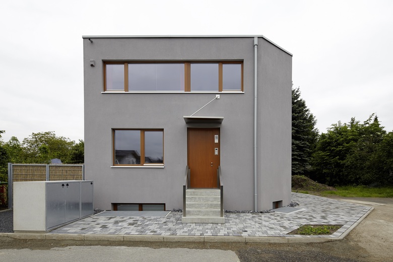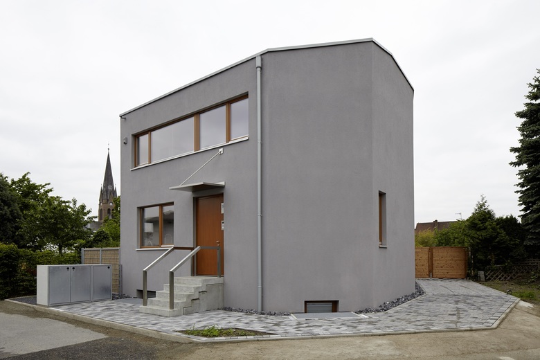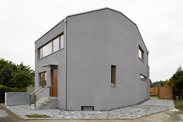 Das Gebäude wird aus zwei Kuben zusammengesetzt. Der erdgeschossige Kubus erstreckt sich parallel zur Strasse von einer Grundstücksgrenze zur anderen. So wird der Vorfahrtsbereich vom Garten klar getrennt. Über diesen Kubus wird ein zweiter in Längsrichtung des Grundstücks verlaufender Kubus gelegt. Dieser wird über seine vordere und hintere Überkragung des unteren Kubus klar definiert und erkennbar. Hierdurch ergibt sich ein vor der Witterung geschützter Eingangsbereich in das Haus und zum Garten hin ein witterungsunabhängiger Freisitz bzw. eine Terrasse.