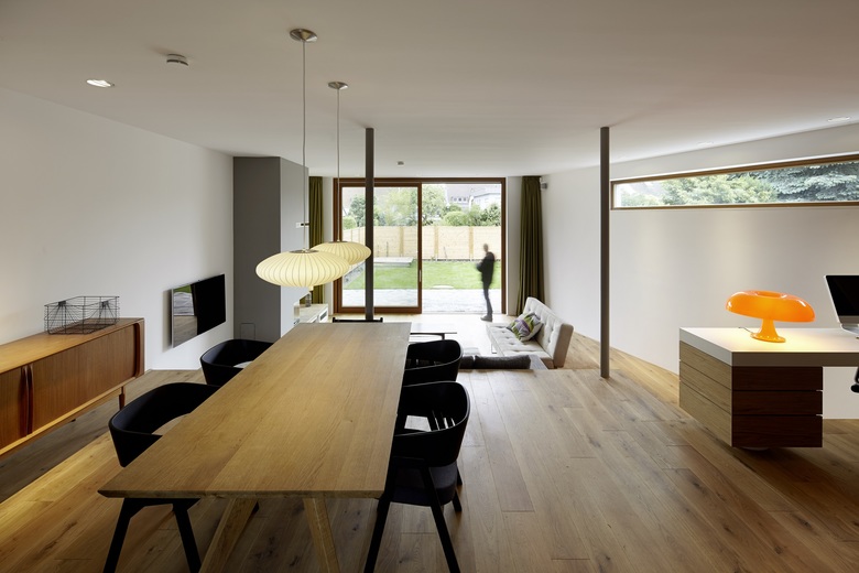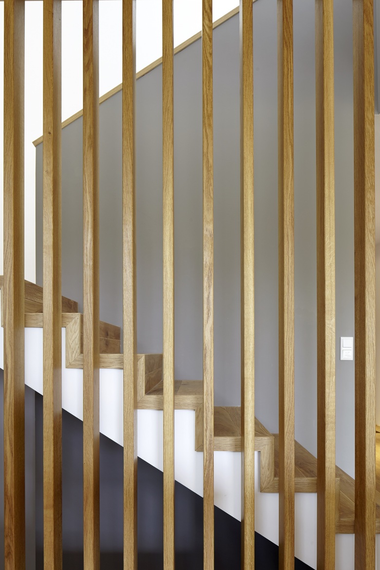Zwei rechteckige Volumina im 90°-Winkel zueinander versetzt definieren Vorfahrt und Garten bzw. überdachen Hauseingang und Freisitz. Das Gebäude stellt durch seine Kubatur eine enge Verbindung zwischen Außen- und Innenraum her.