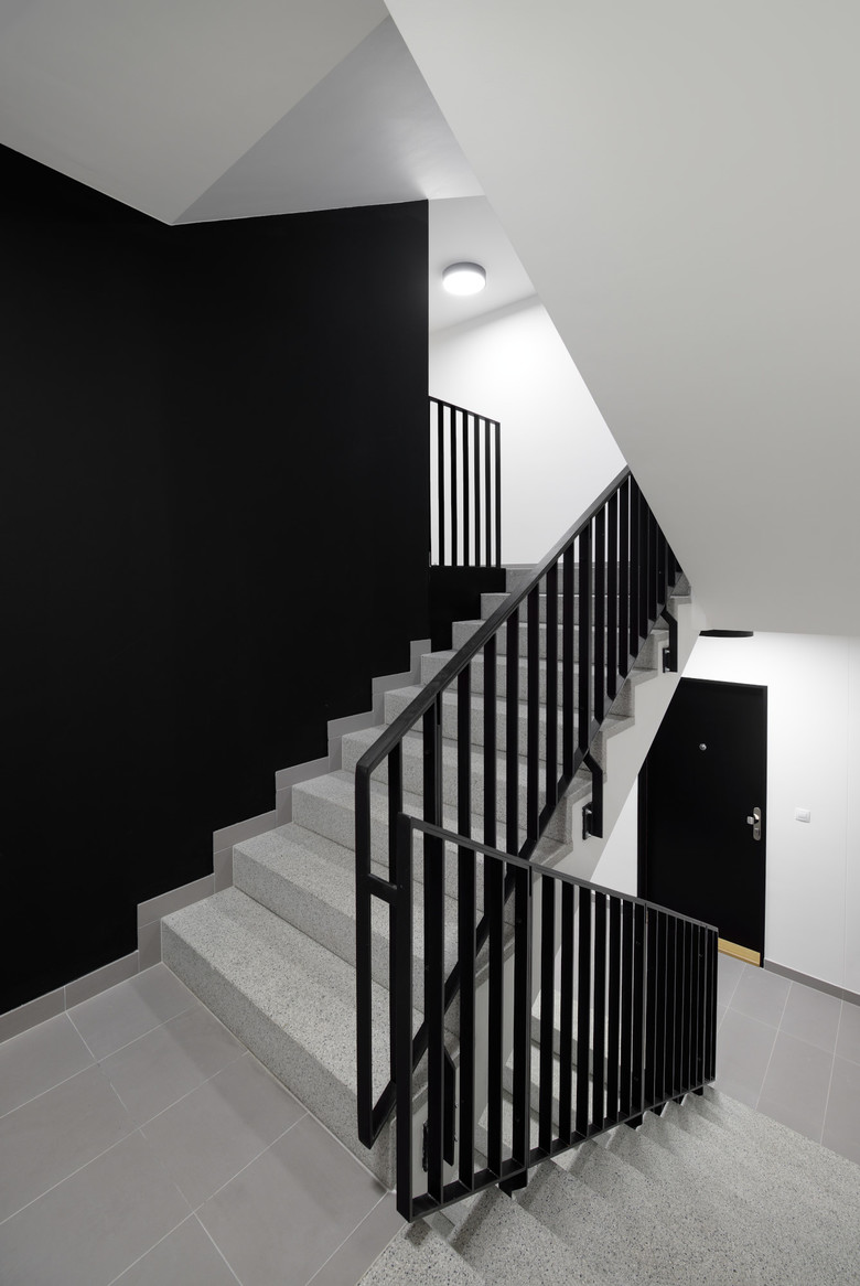 The facade is cladded with hand-molded vertically corrugated white plaster, separated in each floor level by a horizontal black metal strip. The subtraction of the window openings and loggias is accentuated by a warm and smooth red color plaster.