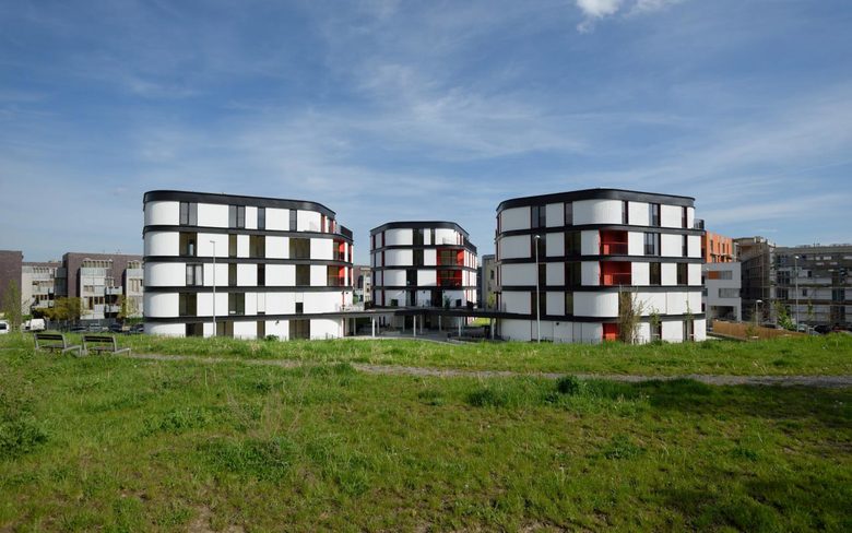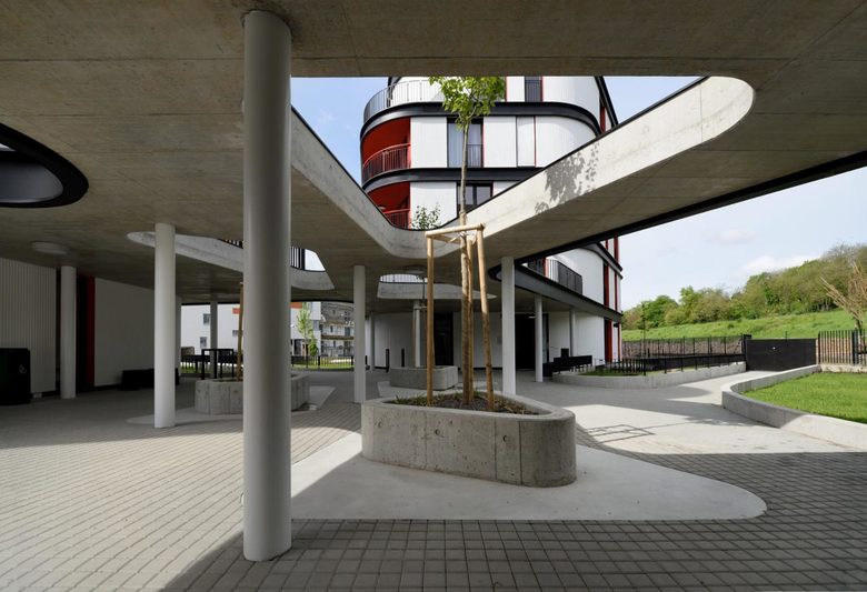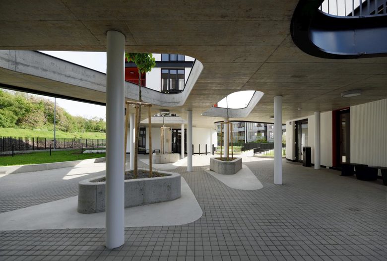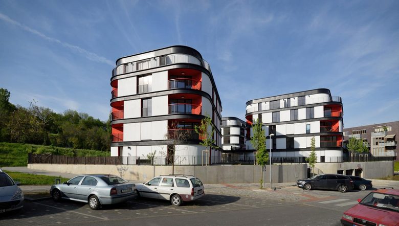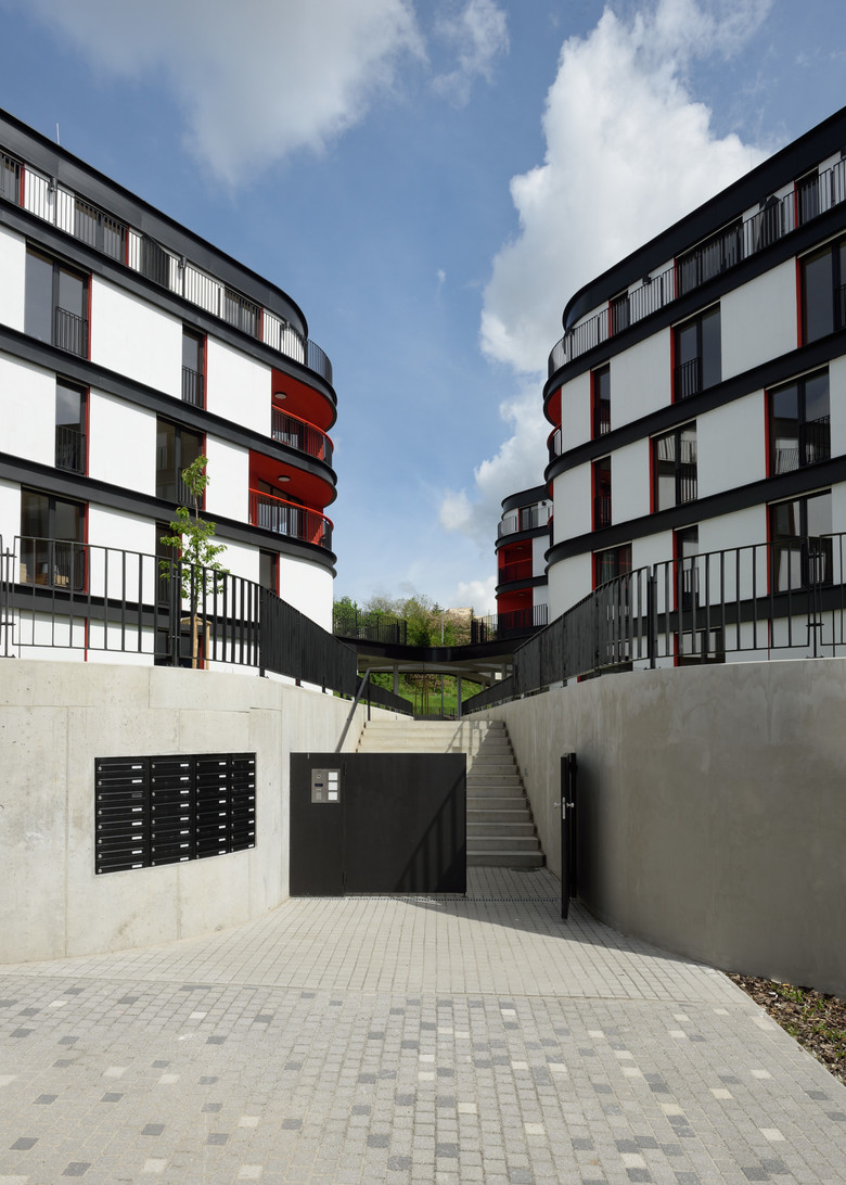 The construction consists of three irregularly shaped five-floor apartment blocks sitting on a common plateau with underground parking and storage space. This raised bastion is defining the surrounding public space and protects the private and semi-private gardens from the street traffic. The organic form of the objects mediates the transition between the adjacent high density housing blocks and the public park. The whole building composition is radially evolving from a central entrance “plaza” which is roofed and serves as a common meeting and relaxing area.