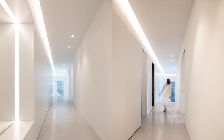 Ein 15 m langer Flur verbindet beide Gebäudeteile miteinander. Auf der linken Flurseite verläuft eine grifflose Möbel-Wandbekleidung, die ohne Vor- und Rücksprünge schnurgerade in einer Flucht verläuft. Deren weiße Fronten werden über die gesamte Länge des Flurs von einem Decken-Lichtkanal in Szene gesetzt. Am Ende des Flurs ist ein Homeoffice-Arbeitsplatz eingerichtet, dessen Funktion sich dem Betrachter erst bei heruntergeklappter Schreibtischplatte offenbart.
