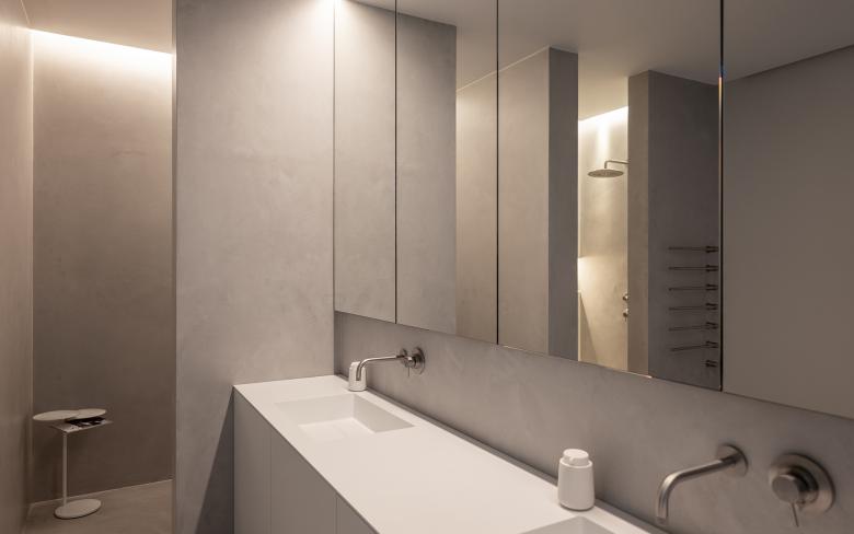 Die Oberflächen sämtlicher Türen und Einbaumöbel sind in mattweißem Schleiflack gefertigt. Der Fußboden ist fugenlos mit einer Beschichtung aus grauem Mikrozement versehen. Die Boden- und Wandoberflächen in den Bädern sind ebenfalls zementgrau beschichtet. Diesem strengen Farbkanon aus Weiß- und Grautönen folgen auch Polstermöbel, Vorhänge und Accessoires.